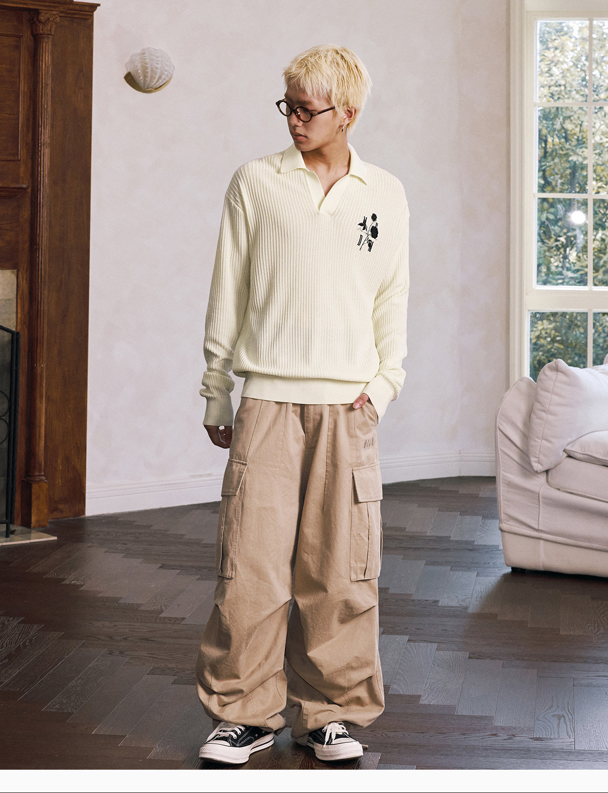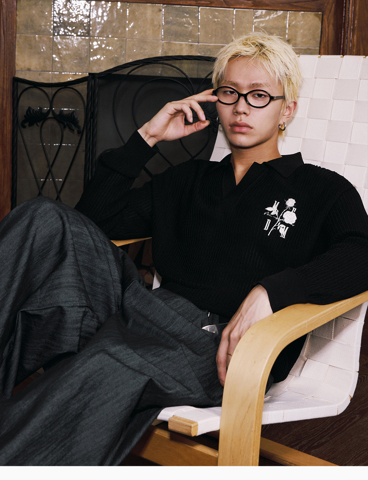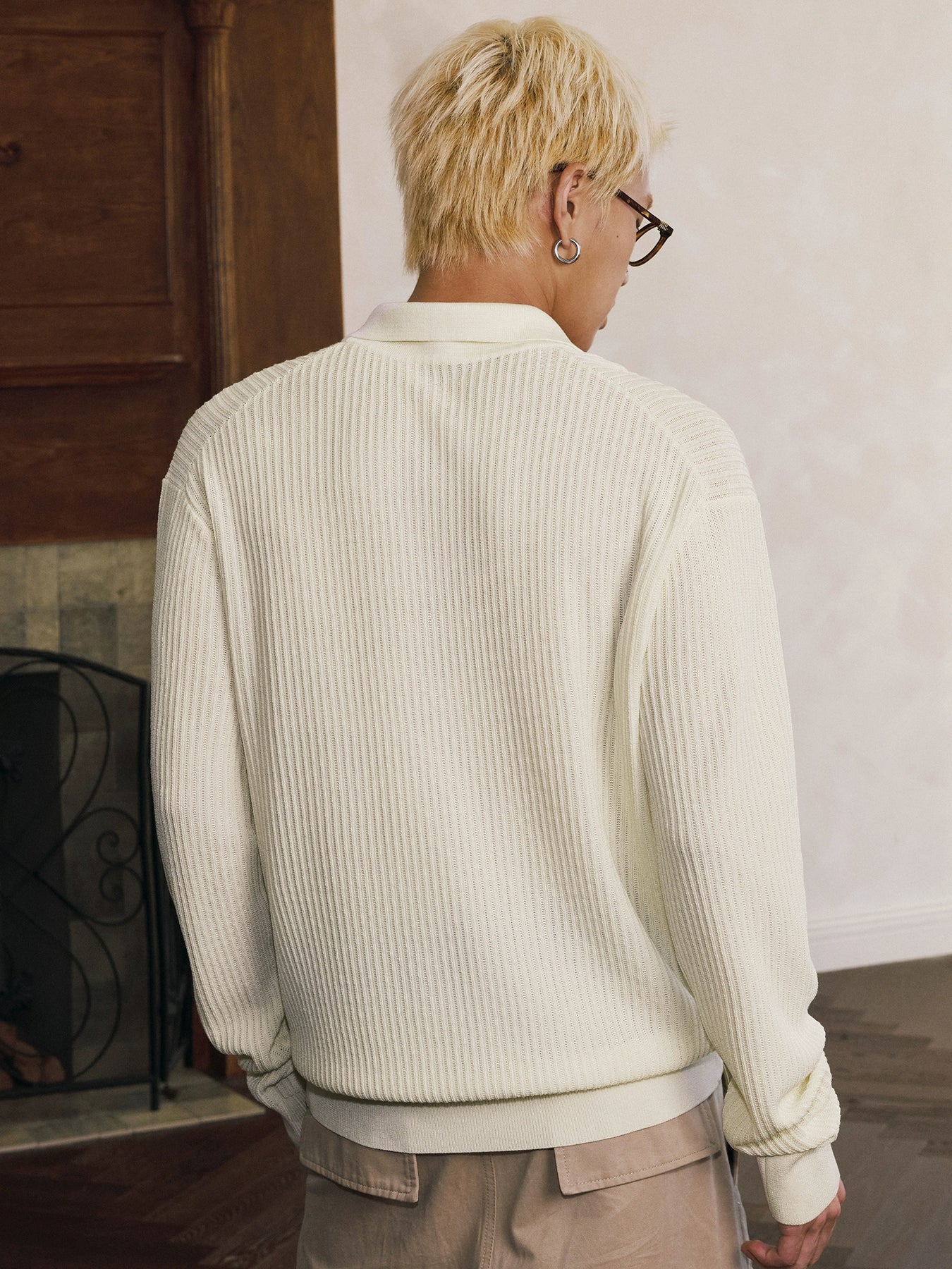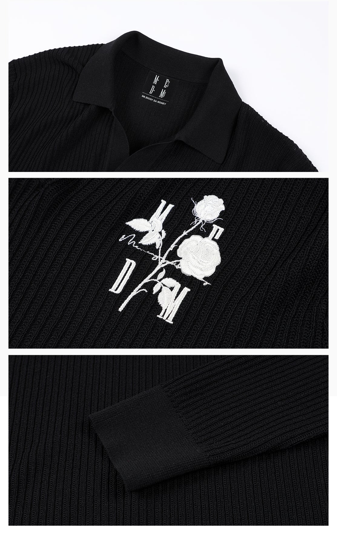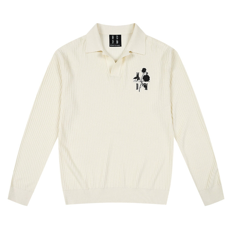 MEDM Rose Embroidered Textured Stripe Knit Long Sleeve Polo | Face 3 Face