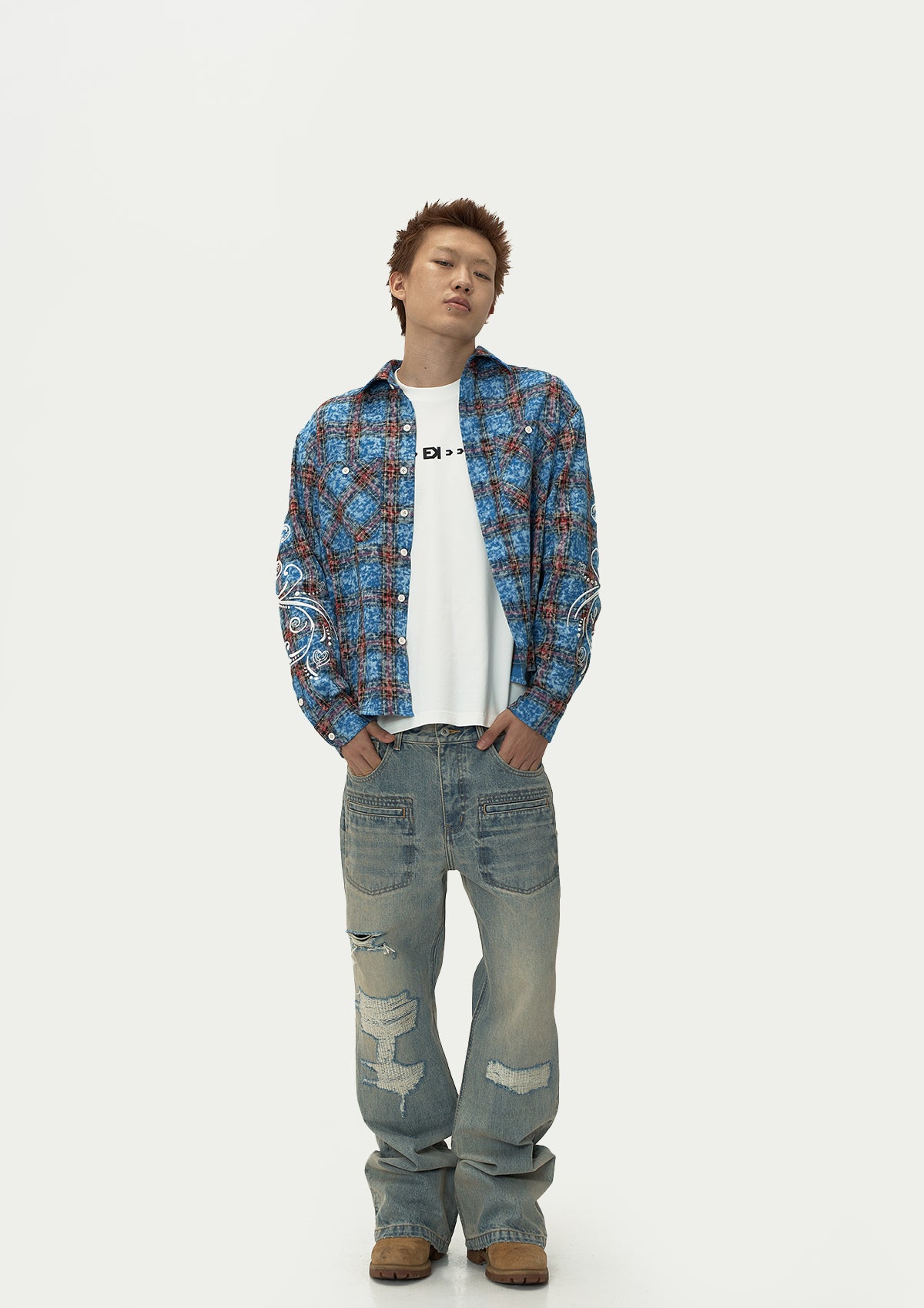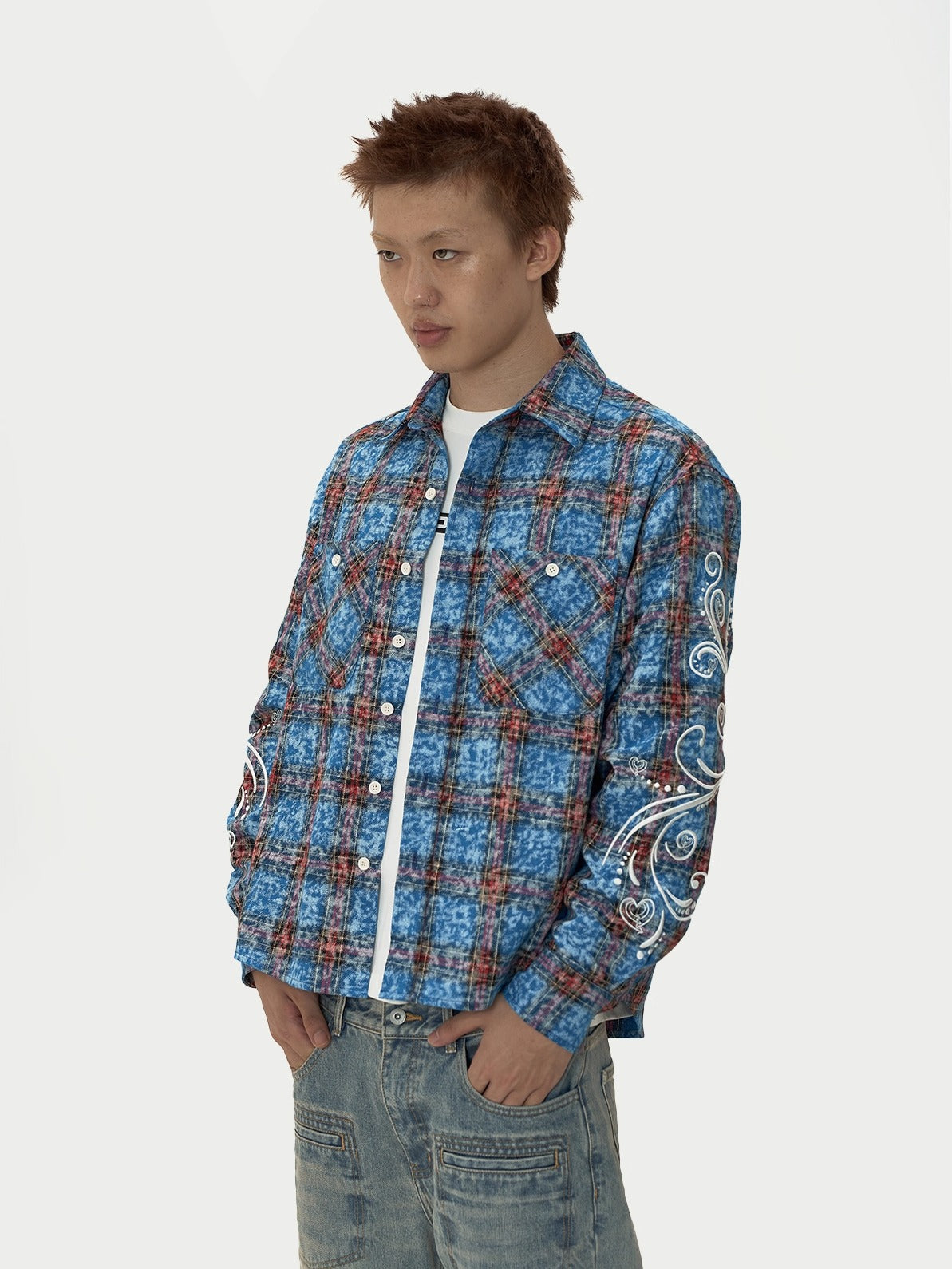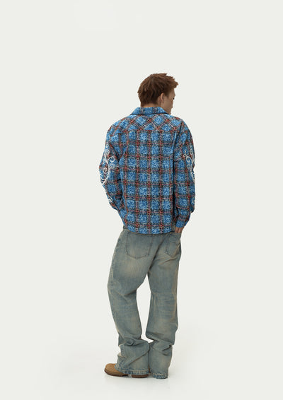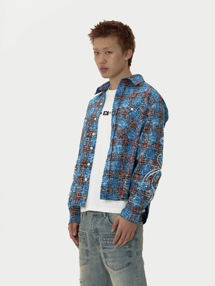 EVILKNIGHT(EK) Floral Embroidered Plaid Long Sleeve Shirt