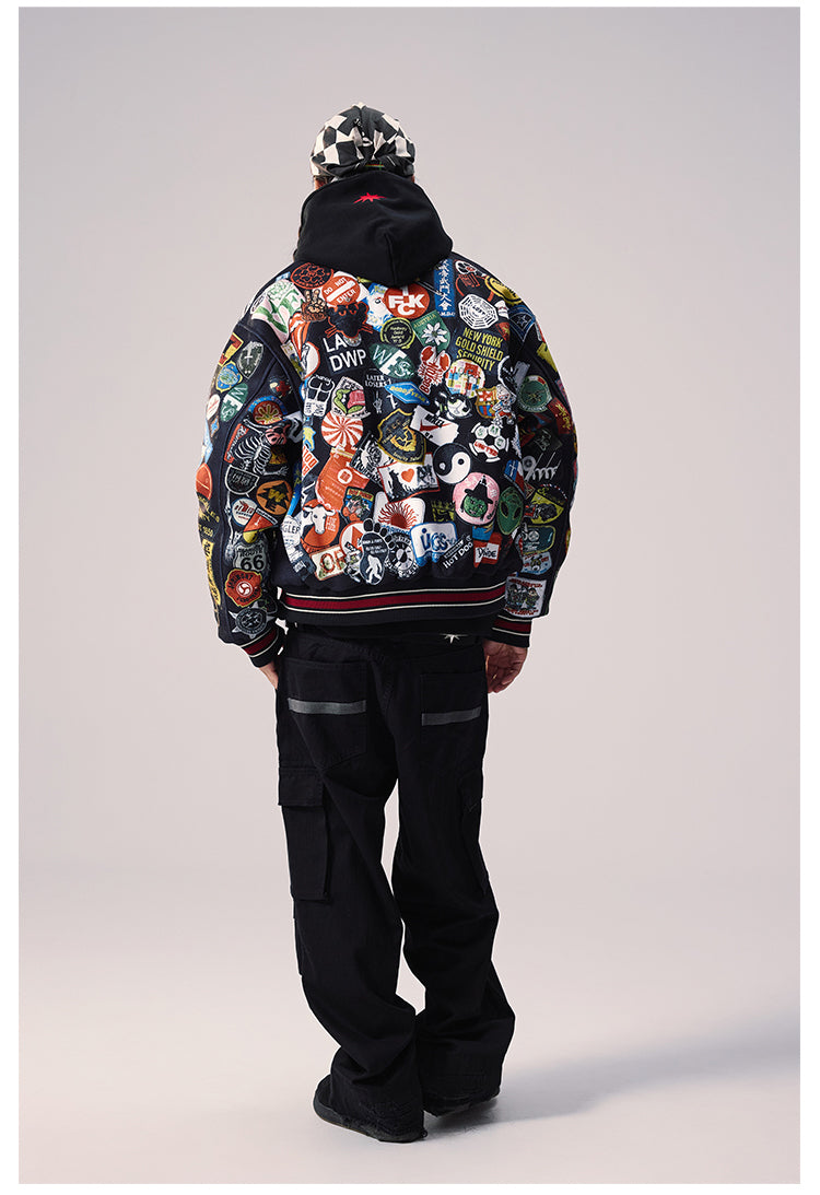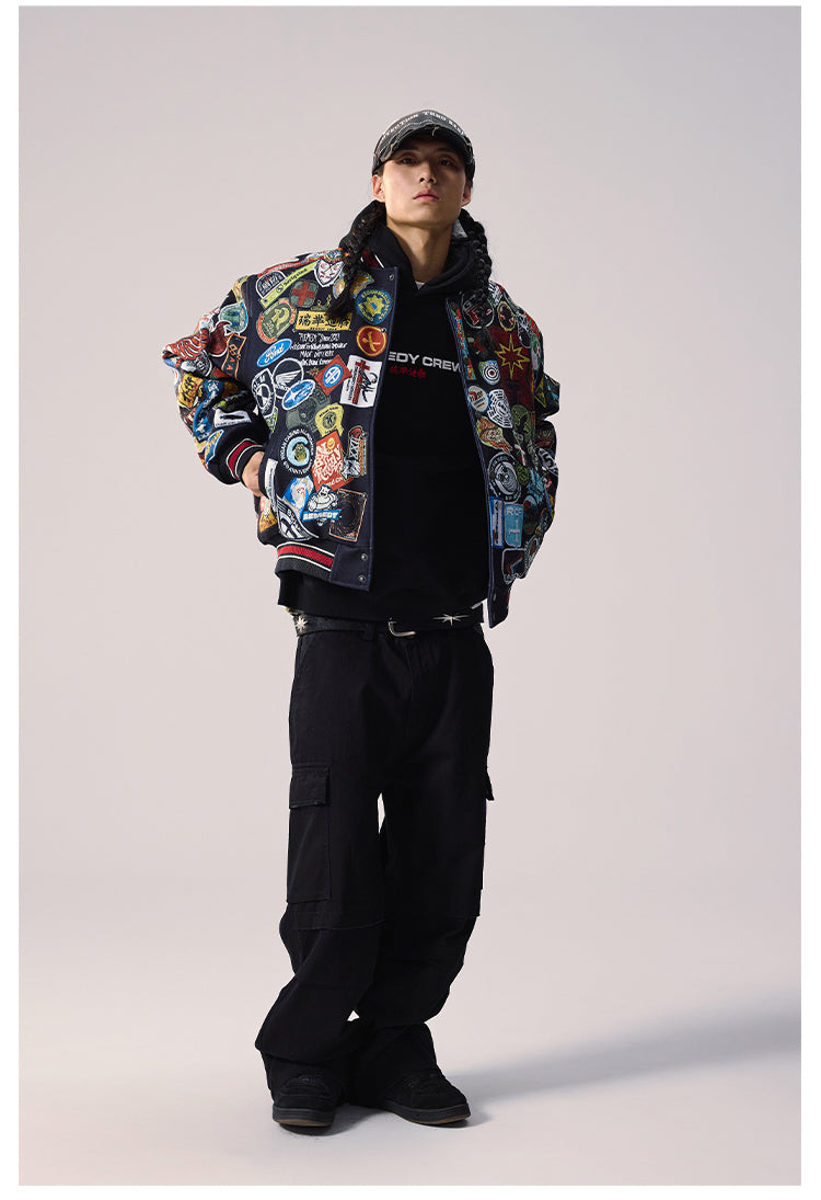 Remedy All Over Badge Print Varsity Jacket | Face 3 Face