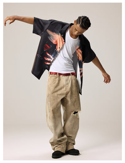 Remedy Finger and Wine Glass Full Print Short Sleeve Cuban Shirt