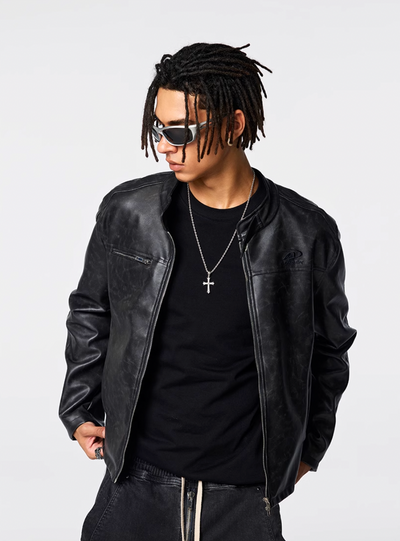 Achock Logo Embroidered Leather Short Motorcycle Jacket