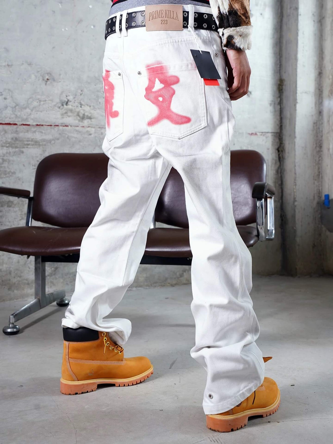 TGFCLUB Kill Graffiti Distressed White Flared Jeans
