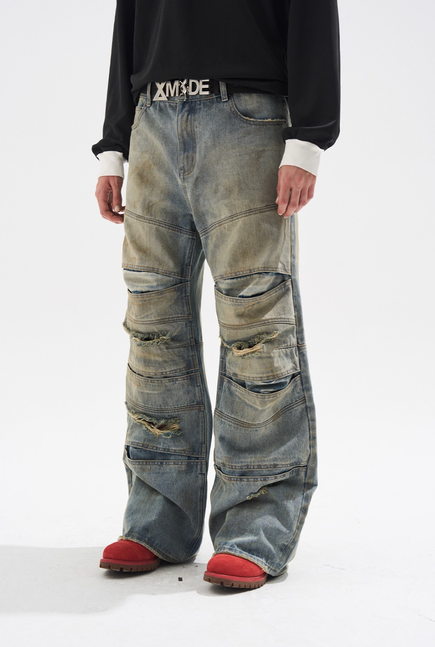 BLIND NO PLAN Layered Split Dirty Washed Baggy Jeans