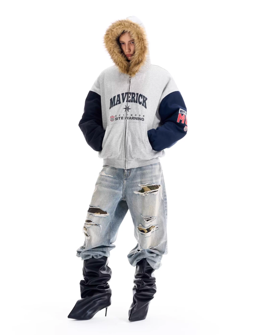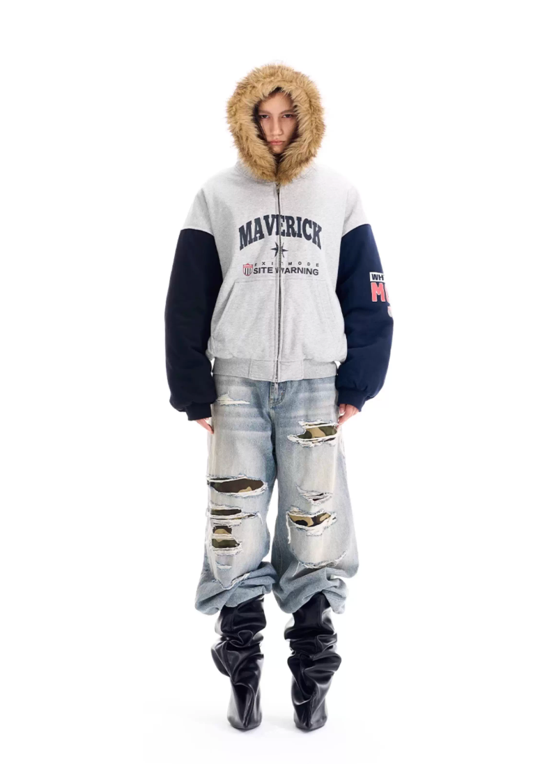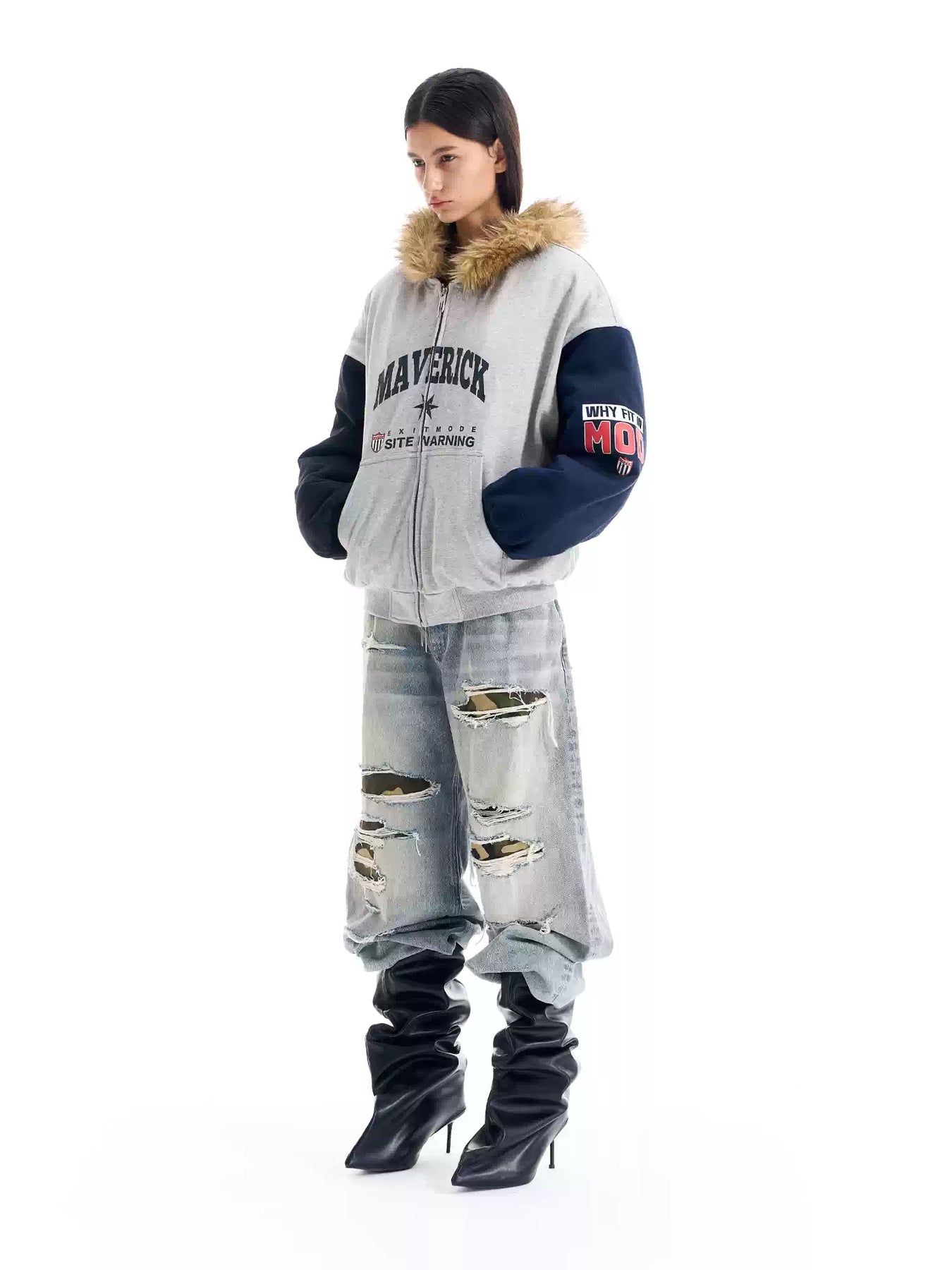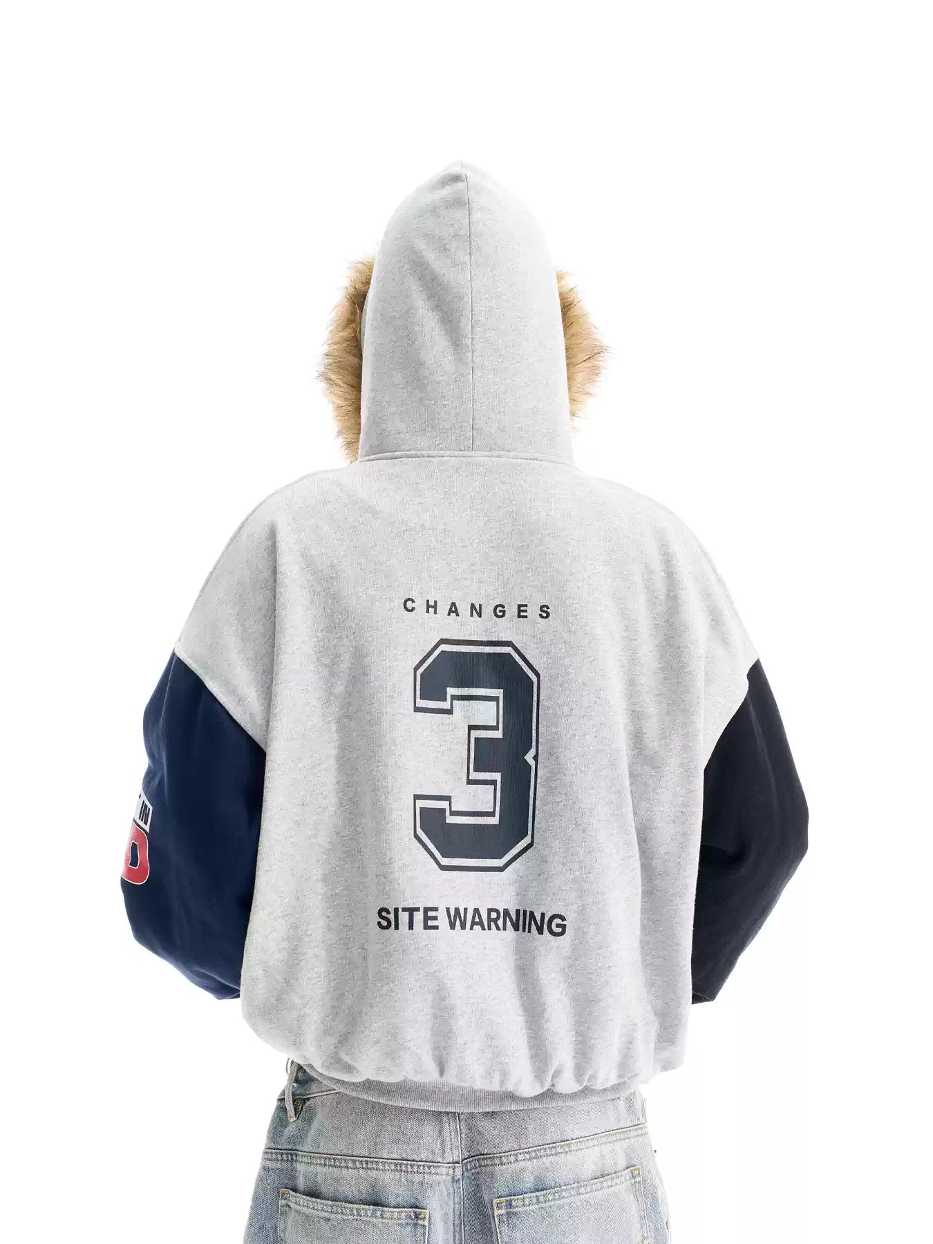 BLIND NO PLAN Gray Color Block Fur Hood Padded Jacket