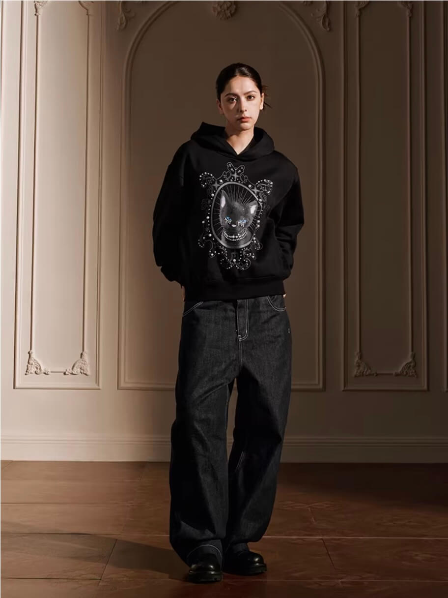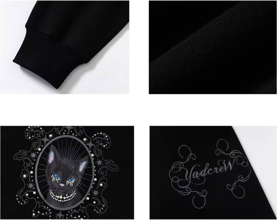 YADcrew Black Cat Print Pearl Hoodie | Face 3 Face