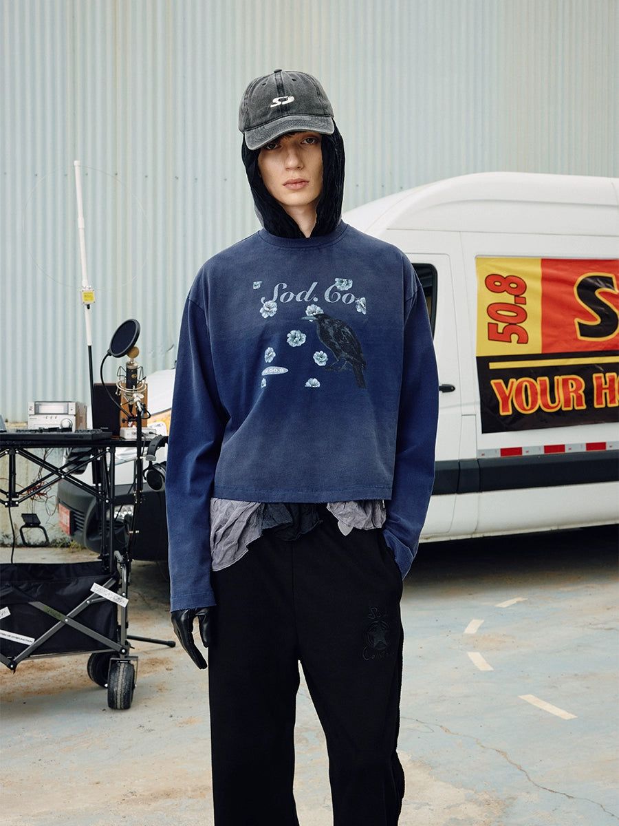 SOD Co. Raven Print Distressed Cropped Long Sleeve Tee