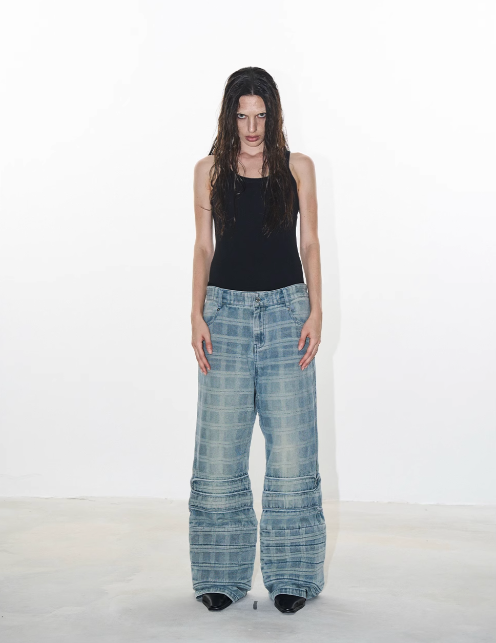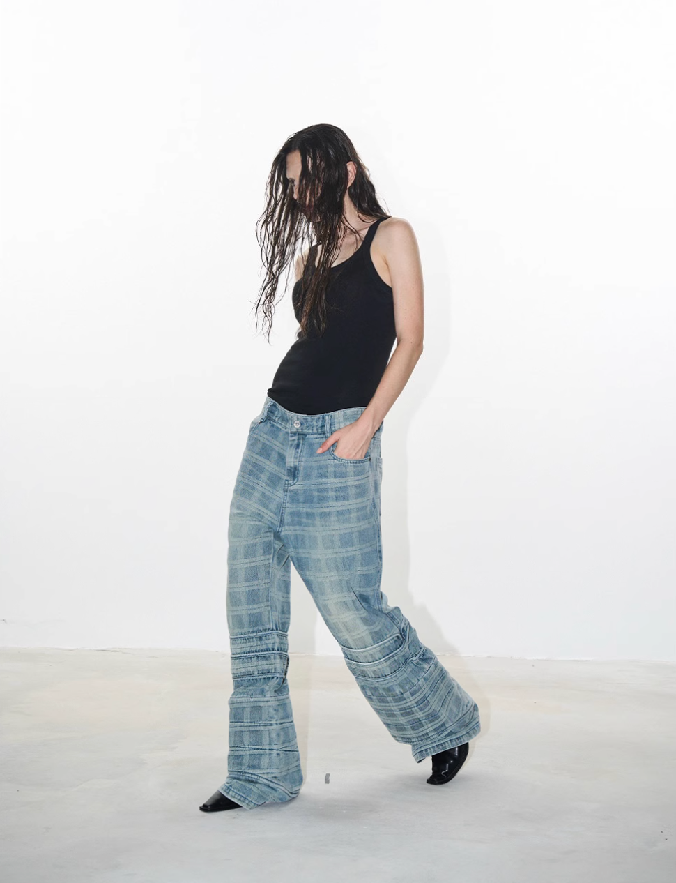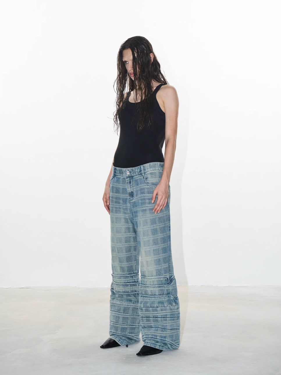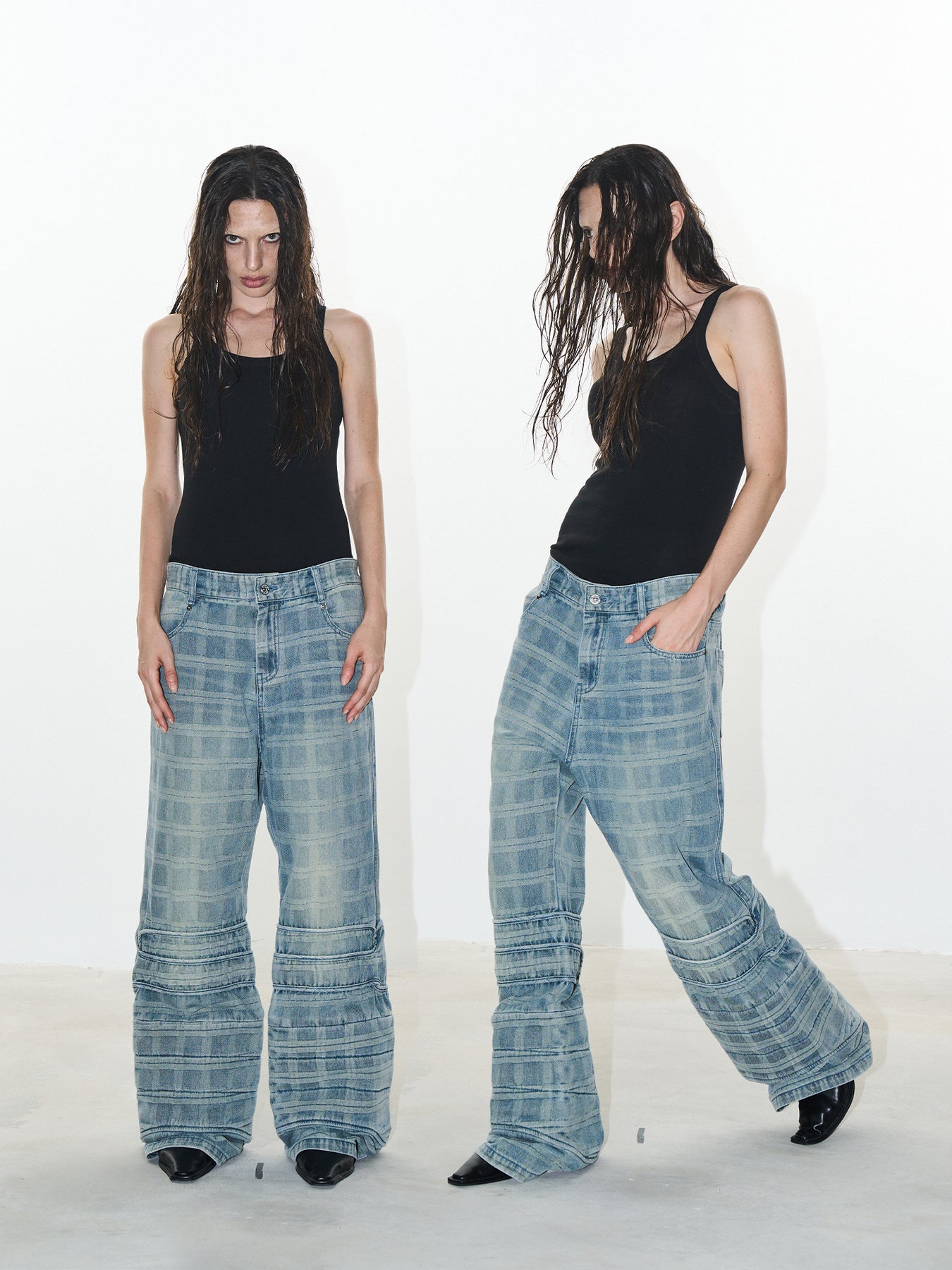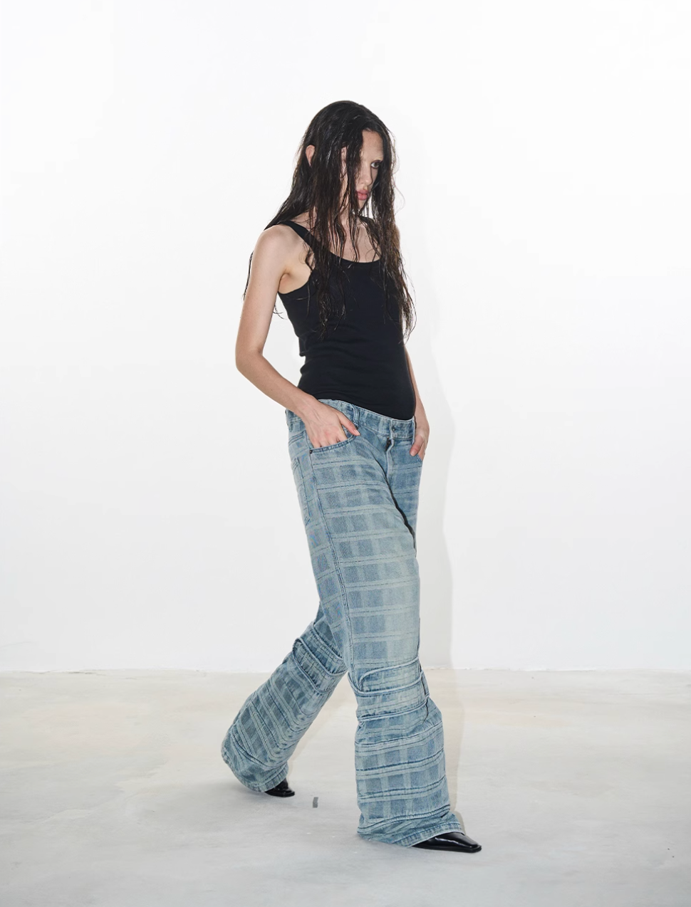 BLIND NO PLAN Plaid Patchwork Bootcut Washed Jeans | Face 3 Face