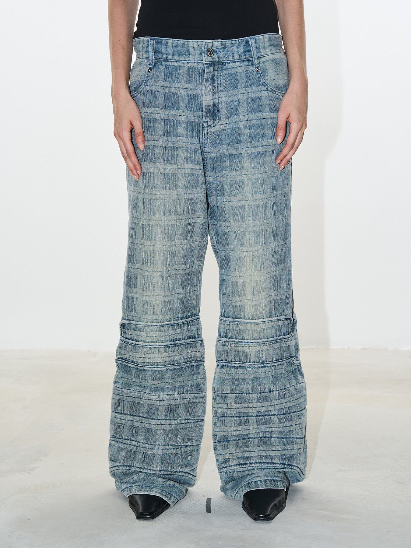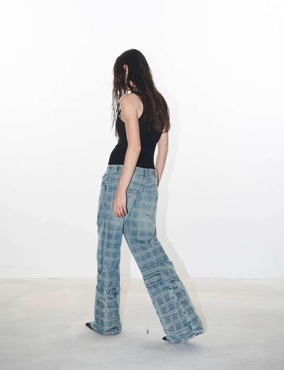 BLIND NO PLAN Plaid Patchwork Bootcut Washed Jeans