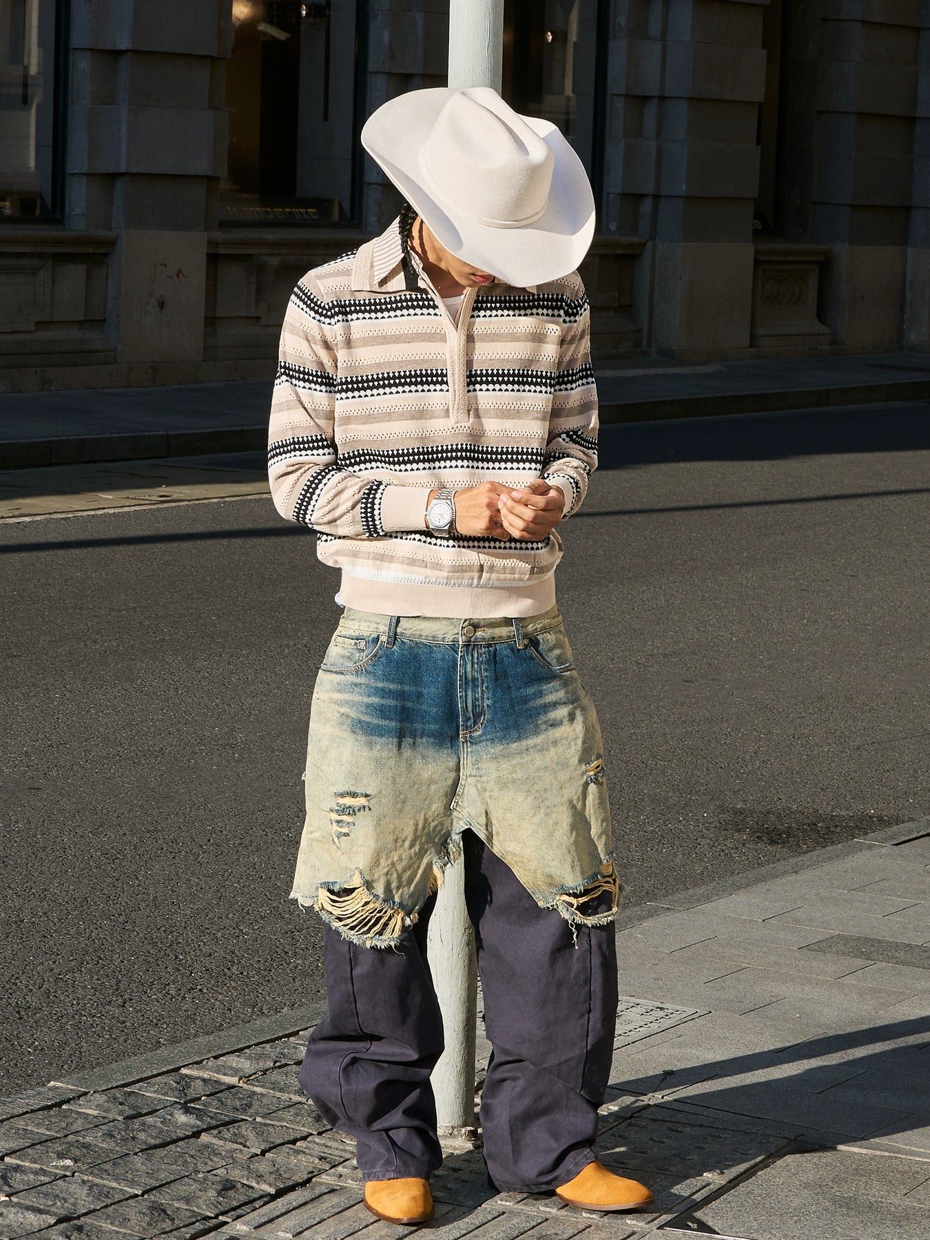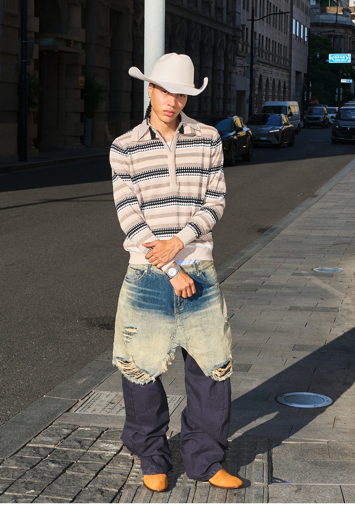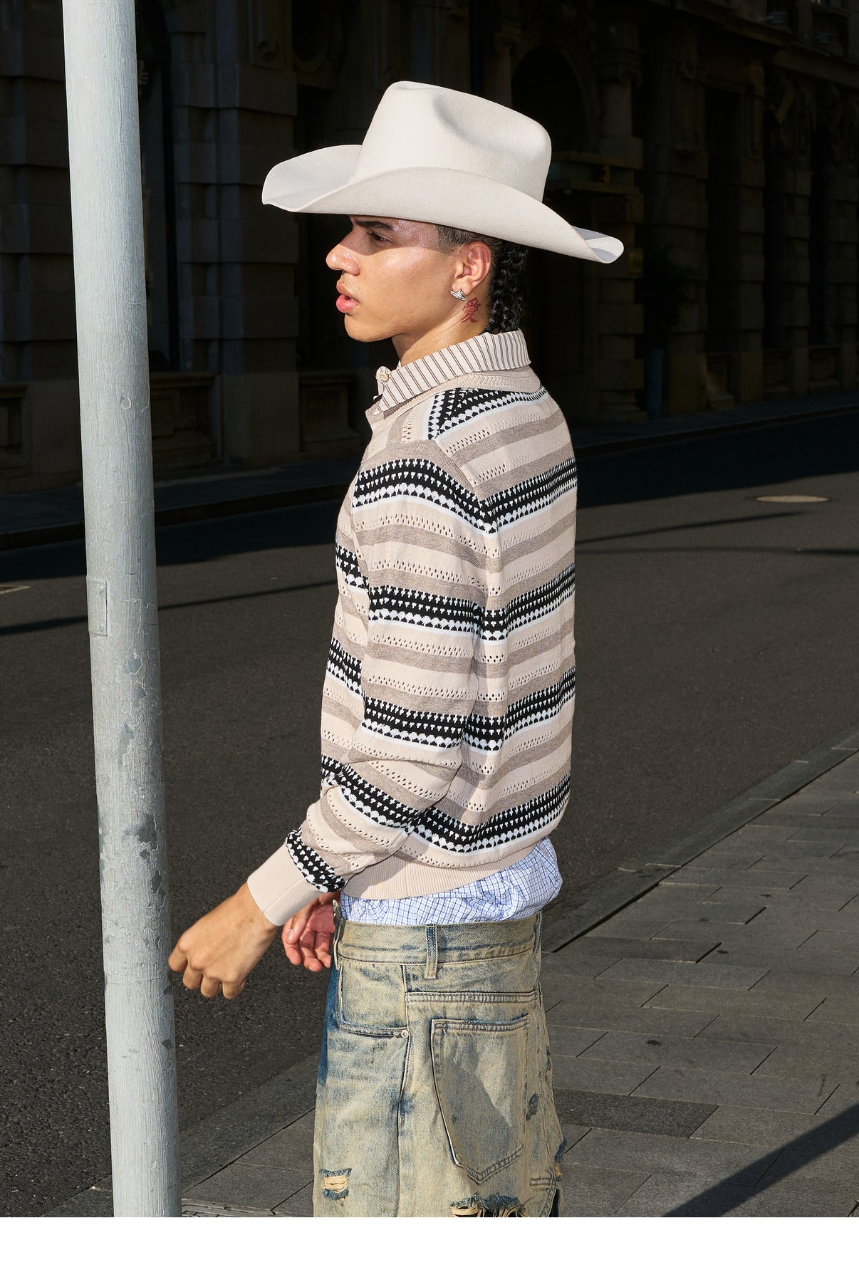 STEEPC Layered Design Knit Striped Long Sleeve Polo | Face 3 Face