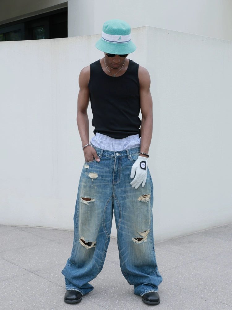 STEEPC Distressed Cat Whisker Washed Baggy Jeans