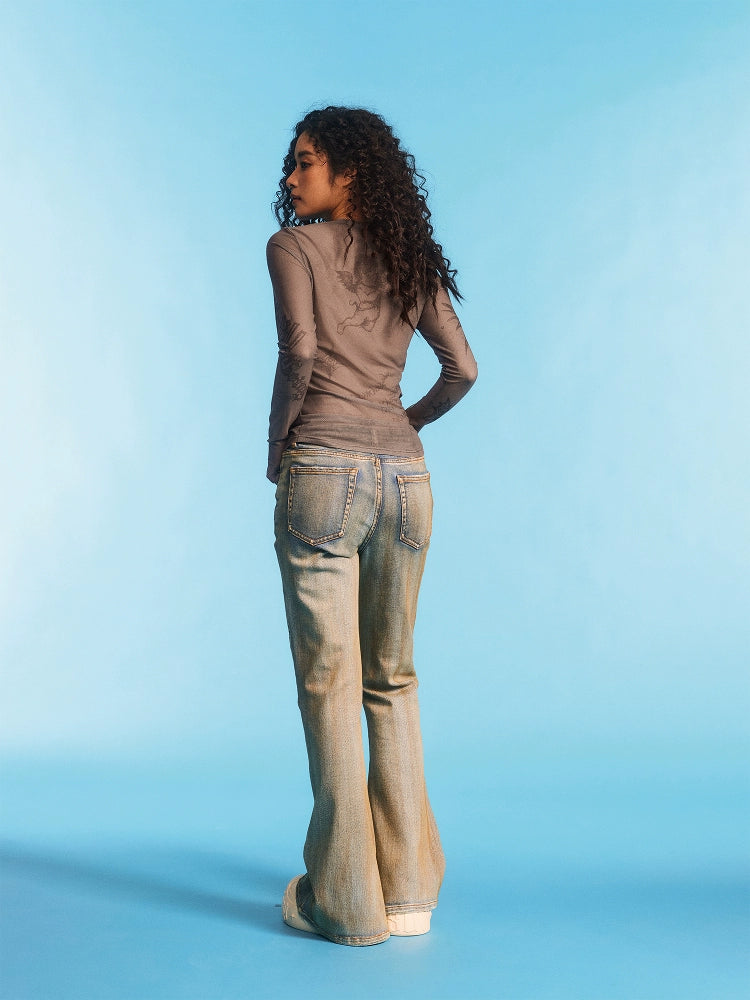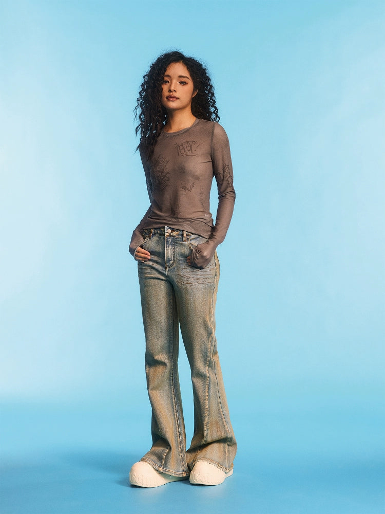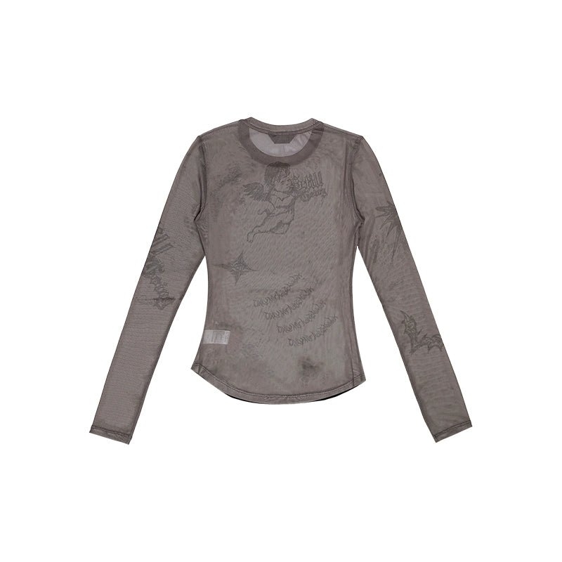 1807 Graffiti Print Mesh Slim Long Sleeve Tee