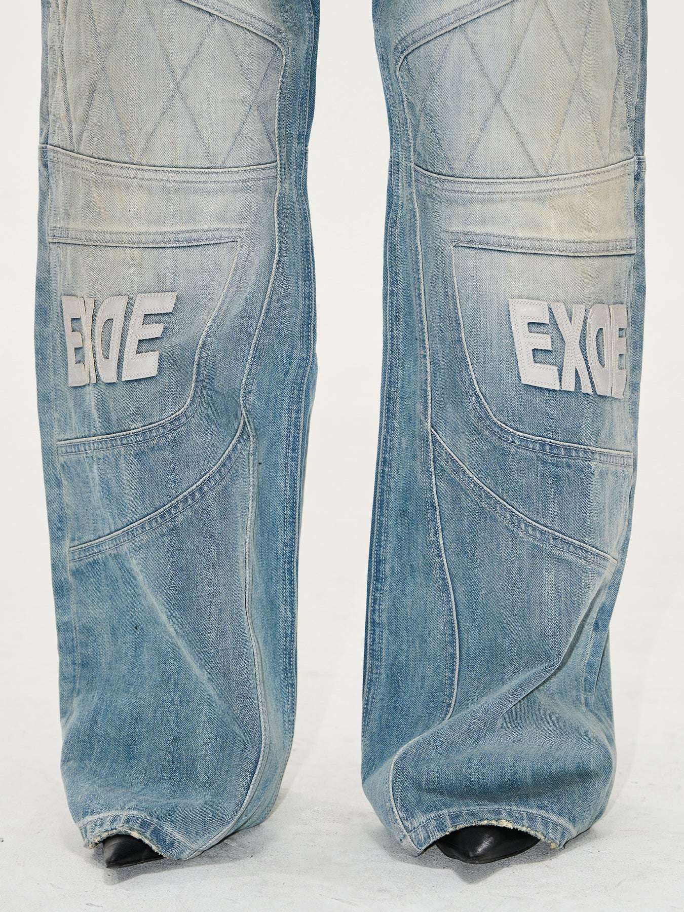 BLIND NO PLAN Washed Biker Patchwork Leather Embroidered Baggy Jeans