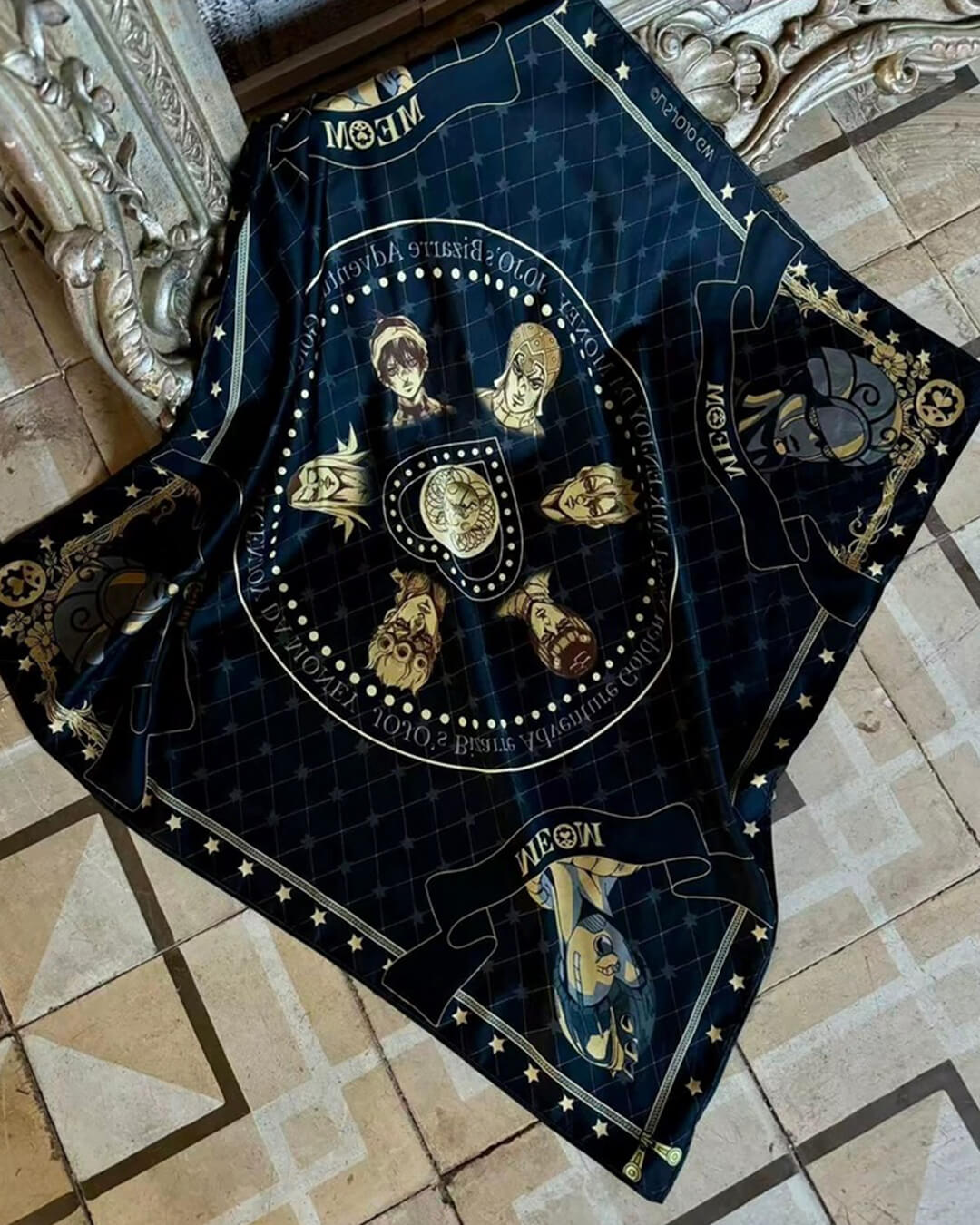 MEDM × JoJo's Bizarre Adventure collaboration scarf inspired by Golden Wind. This 63×63 cm accessory merges streetwear aesthetics with iconic anime character imagery, delivering a statement piece for devoted fans and fashion enthusiasts. The generous square format offers versatile styling options—wear as a traditional scarf, bandana, or headwrap. Premium print quality ensures vibrant character details that withstand regular wear. A must-have for collectors seeking limited-edition crossover pieces that bridge high fashion and pop culture.