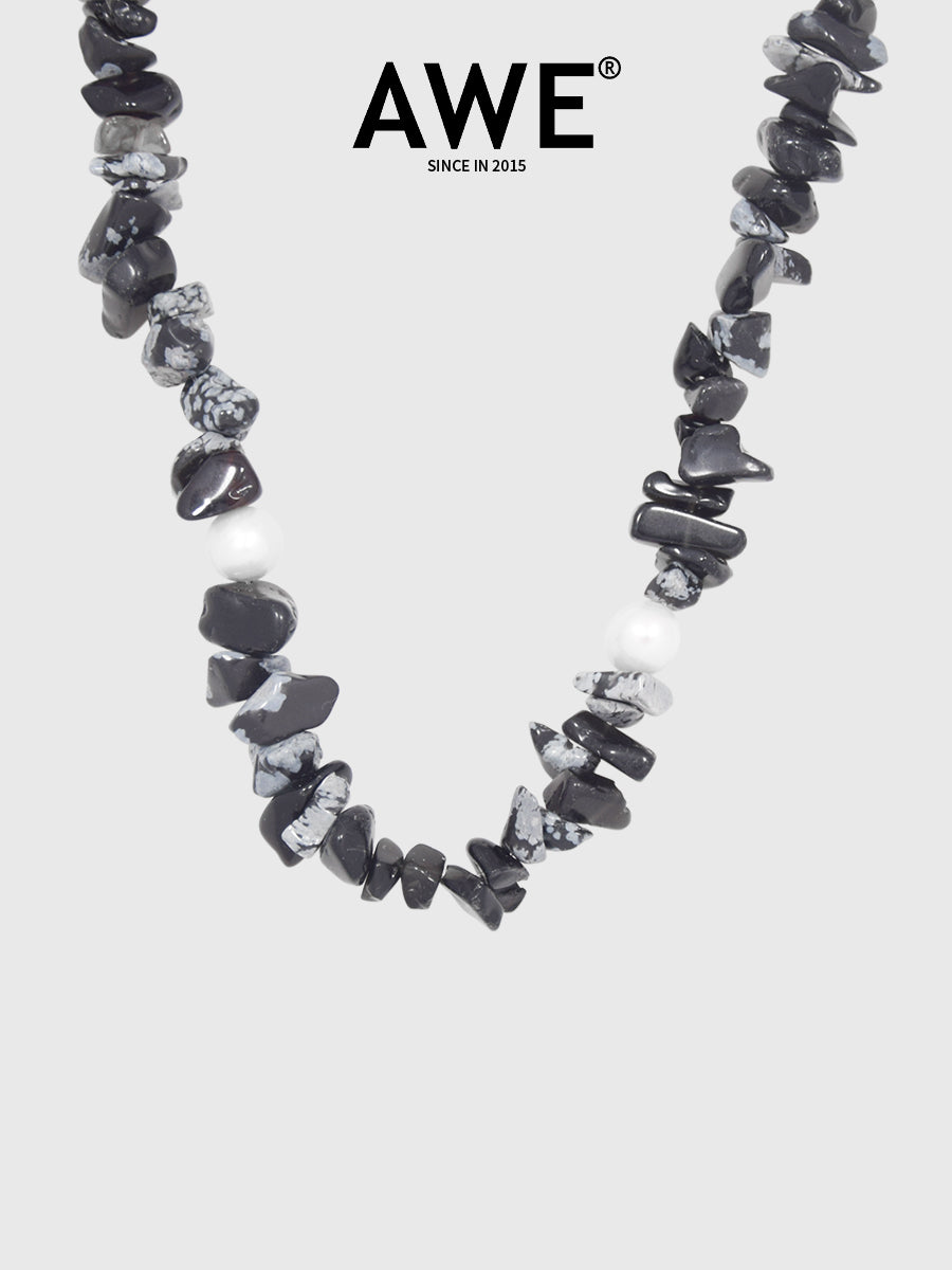 Elevate your street style with the AWE Black Crushed Stone Pearl Beaded Necklace. Handcrafted with black crushed stone and delicate pearl beads, this stunning piece of streetwear jewelry adds a touch of edgy elegance to any outfit. Upgrade your jewelry collection with this unique and eye-catching necklace.