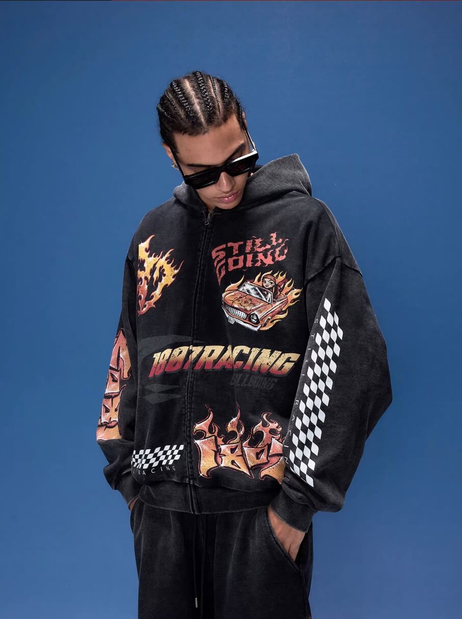 1807 Racing Graffiti Printed Washed Zip Up Hoodie