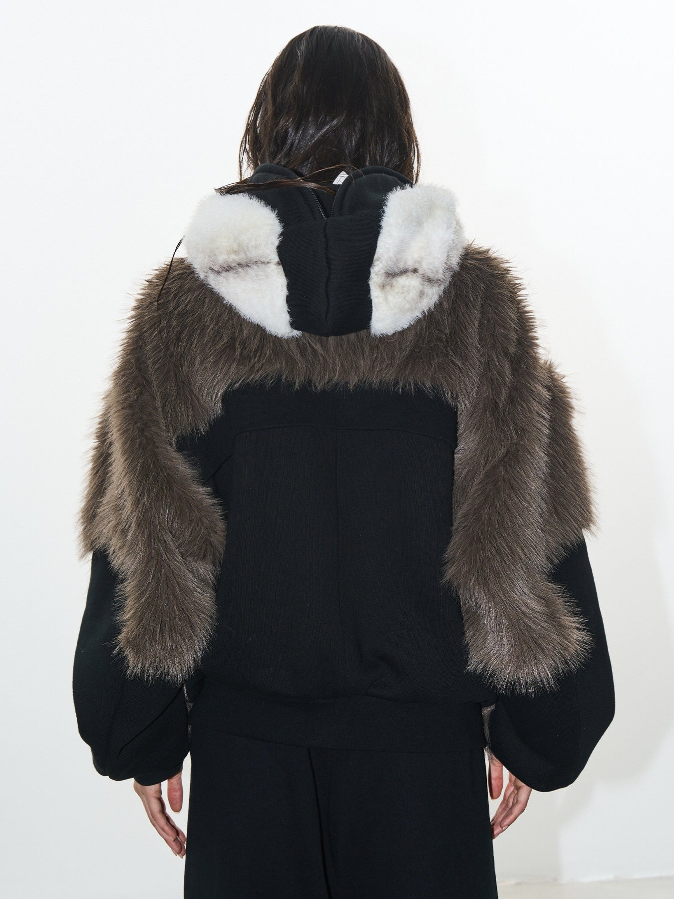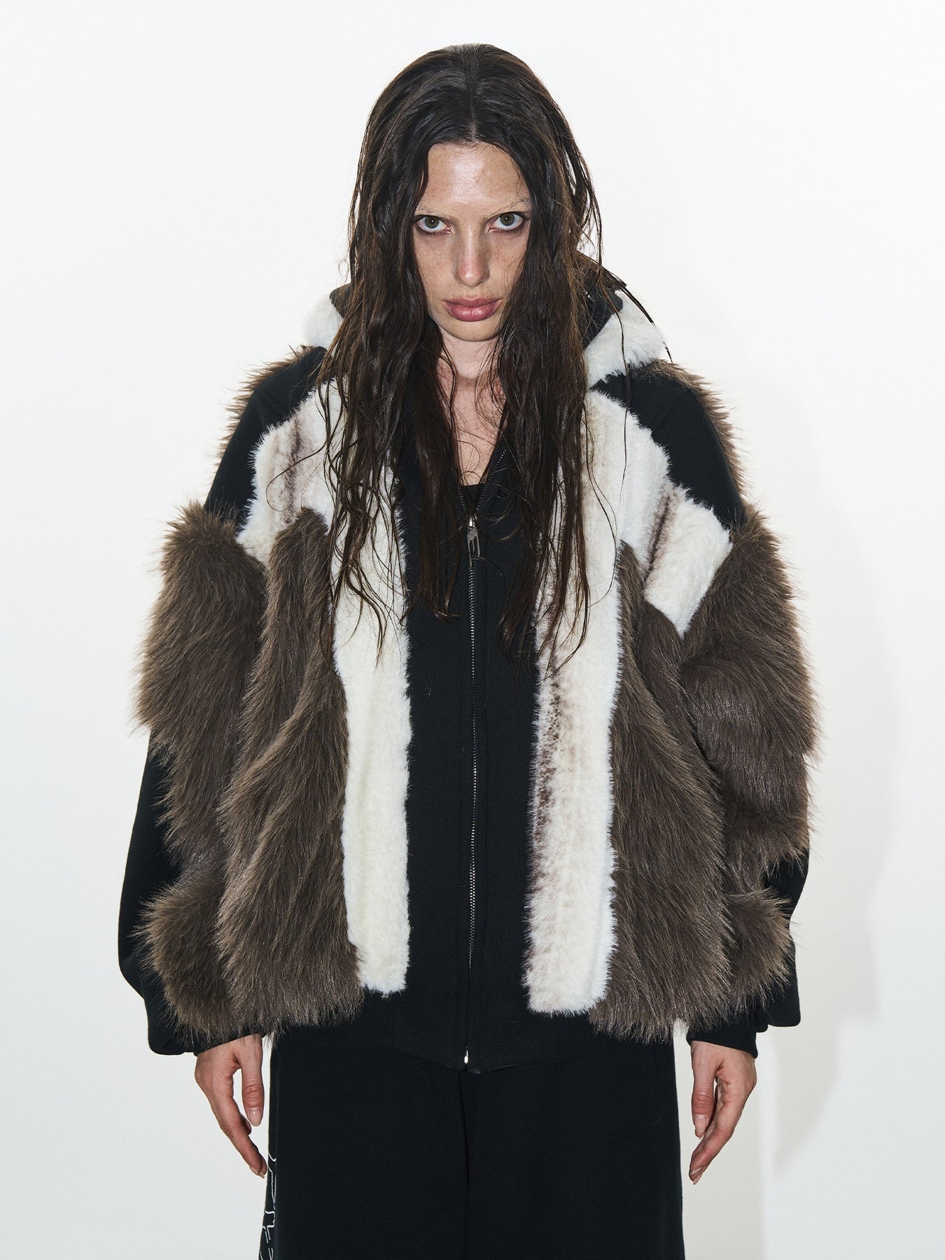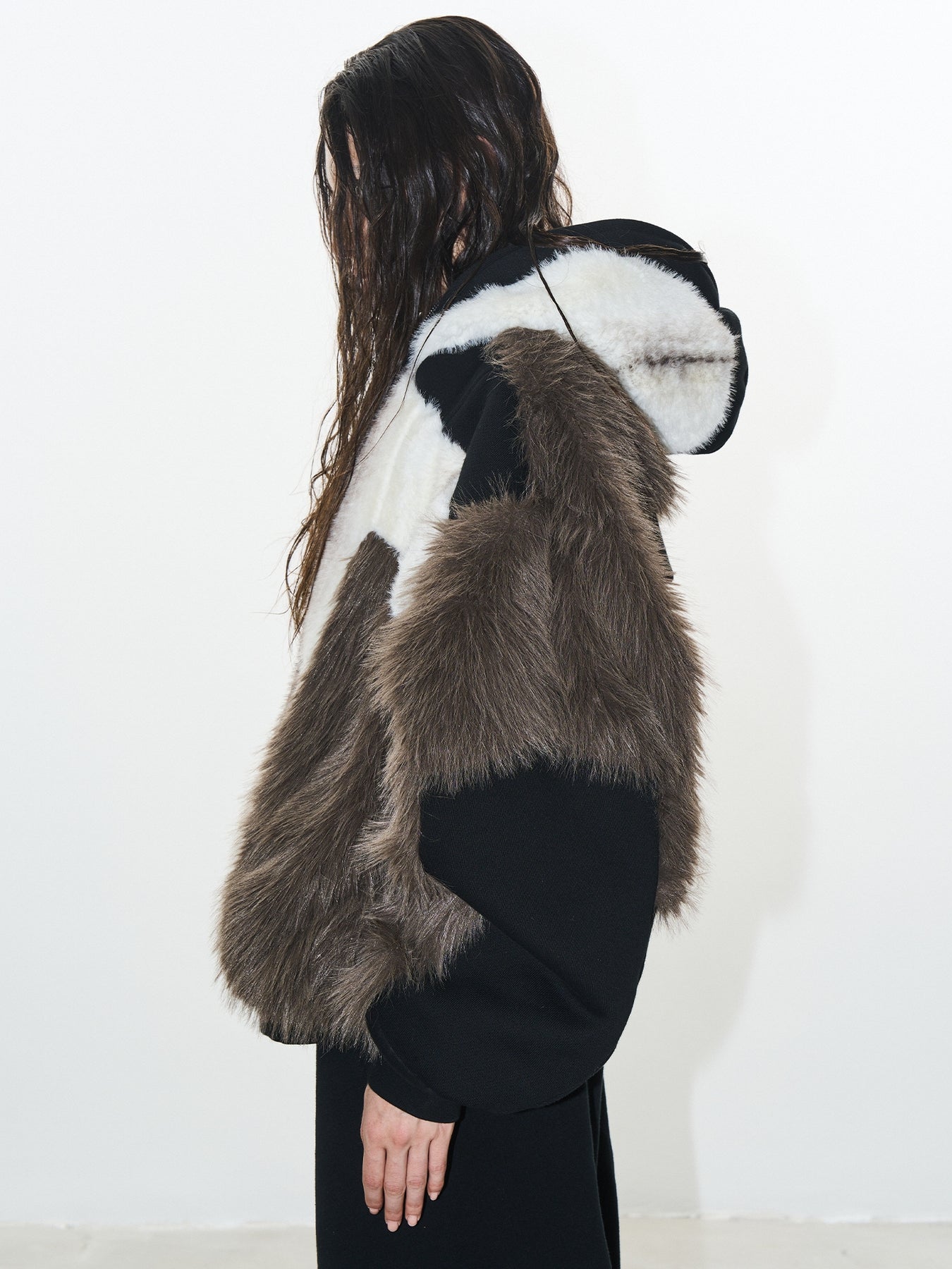 BLIND NO PLAN Colorblocked Hooded Fur Jacket