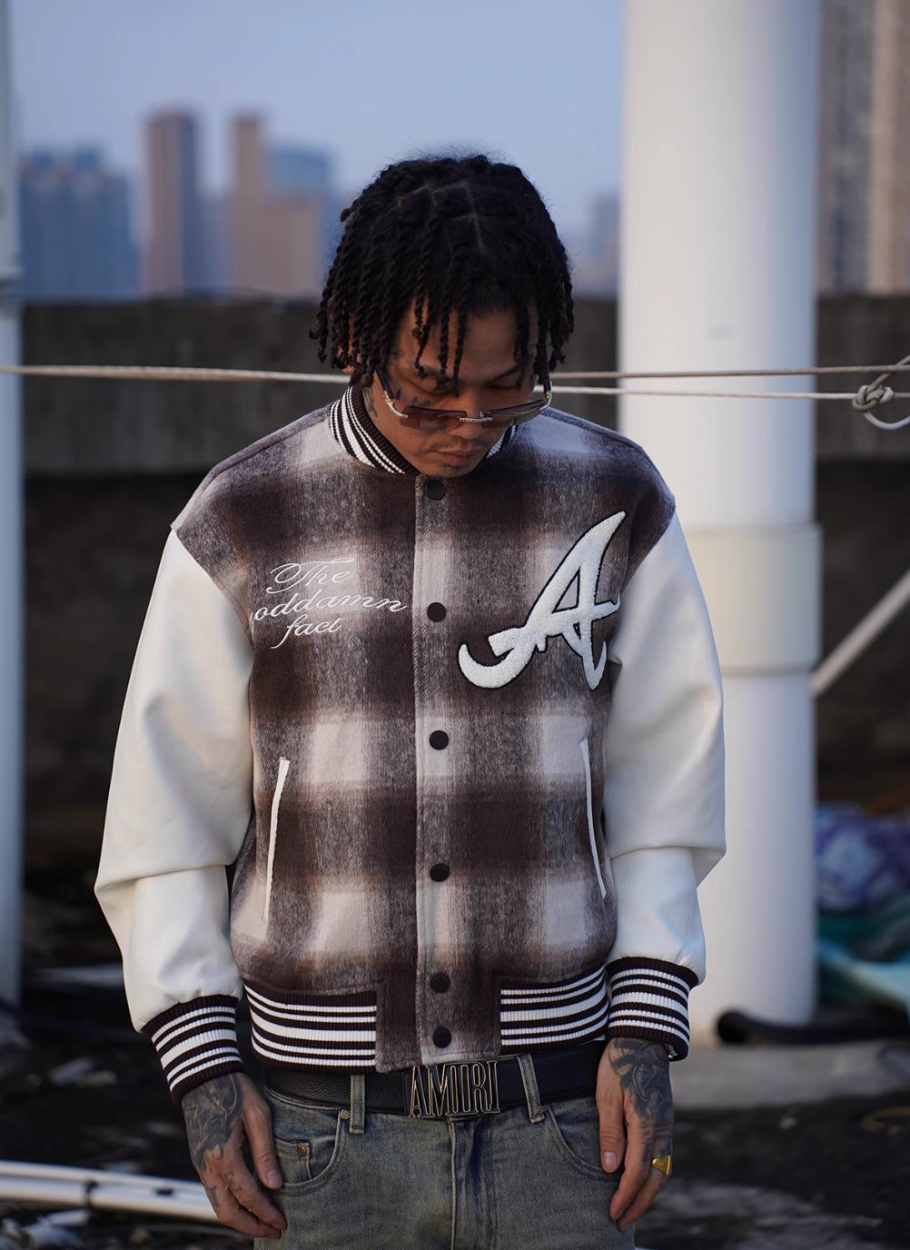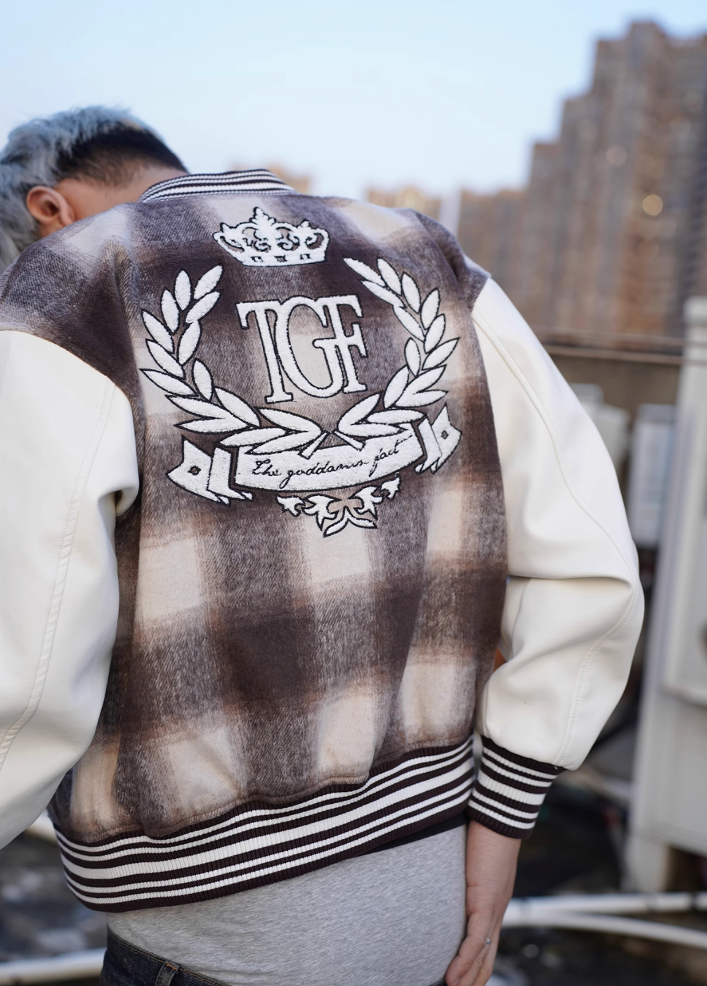 TGFCLUB Embroidered Plaid PU Leather Varsity Jacket | Face 3 Face