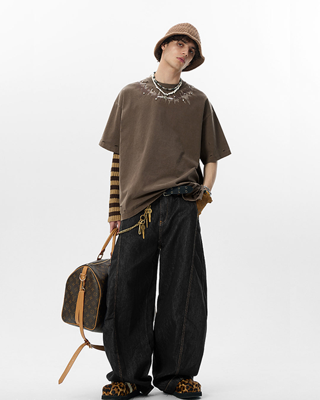 JHYQ Diamond Stud Logo Print Distressed Tee