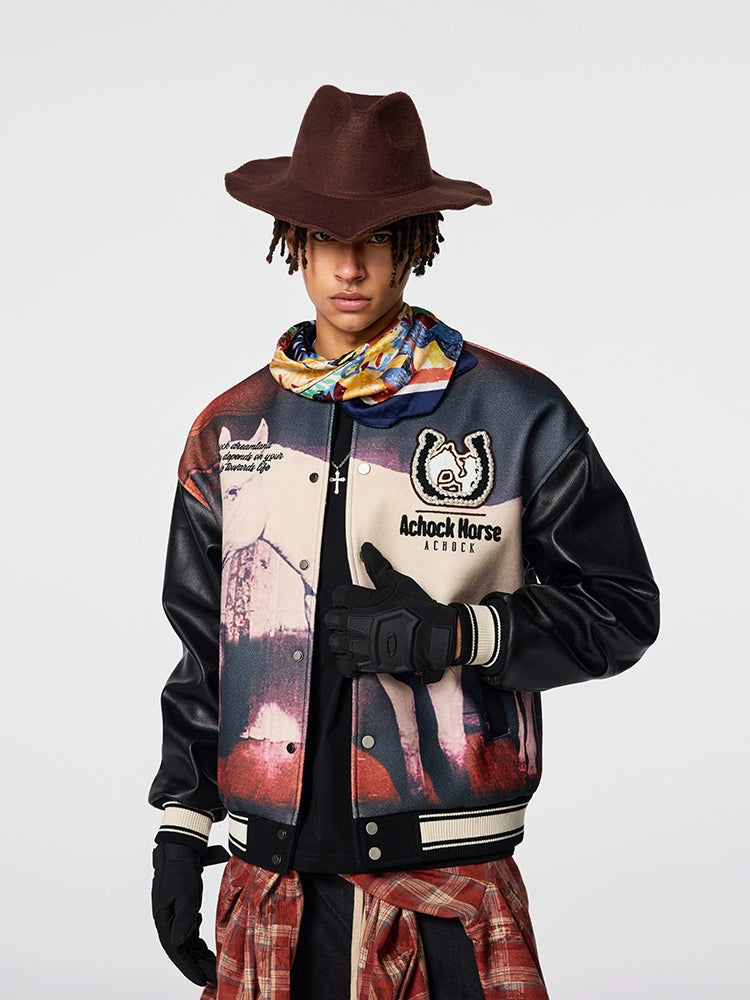 Achock Western Cowboy Full Print PU Leather Varsity Jacket