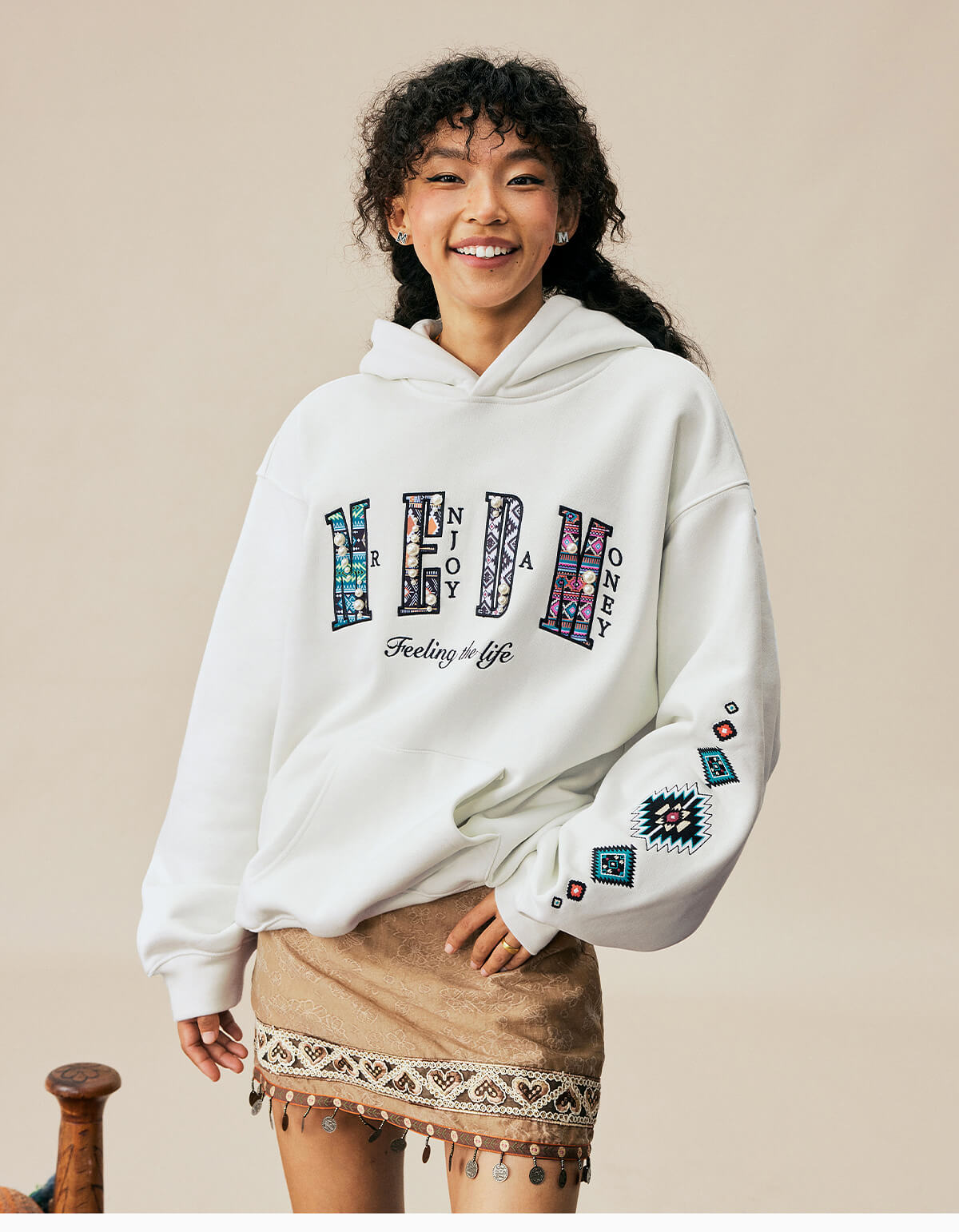 MEDM Ethnic Embroidered Patch Pearl Oversized Hoodie | Face 3 Face
