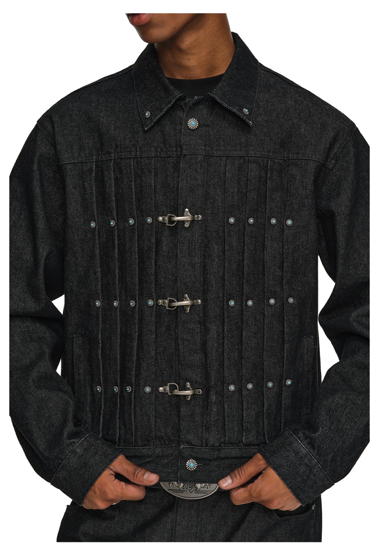 ANTIDOTE Turquoise Studded Pleated Buckle Denim Jacket