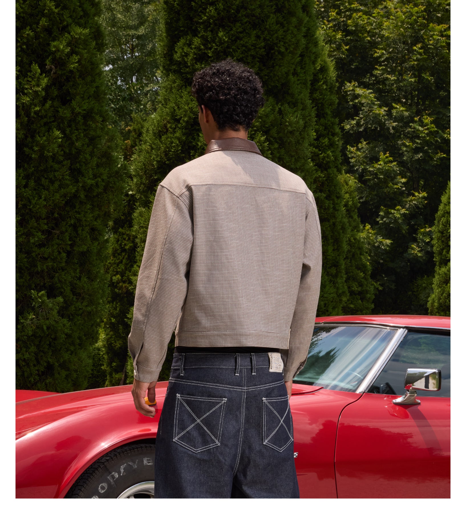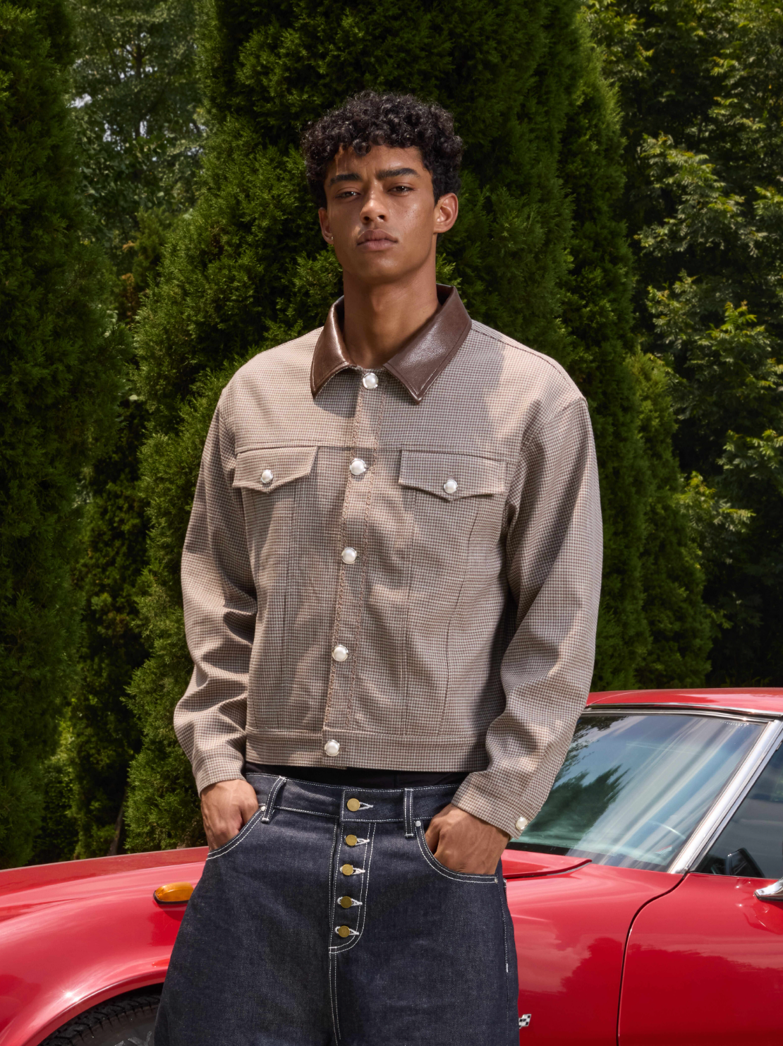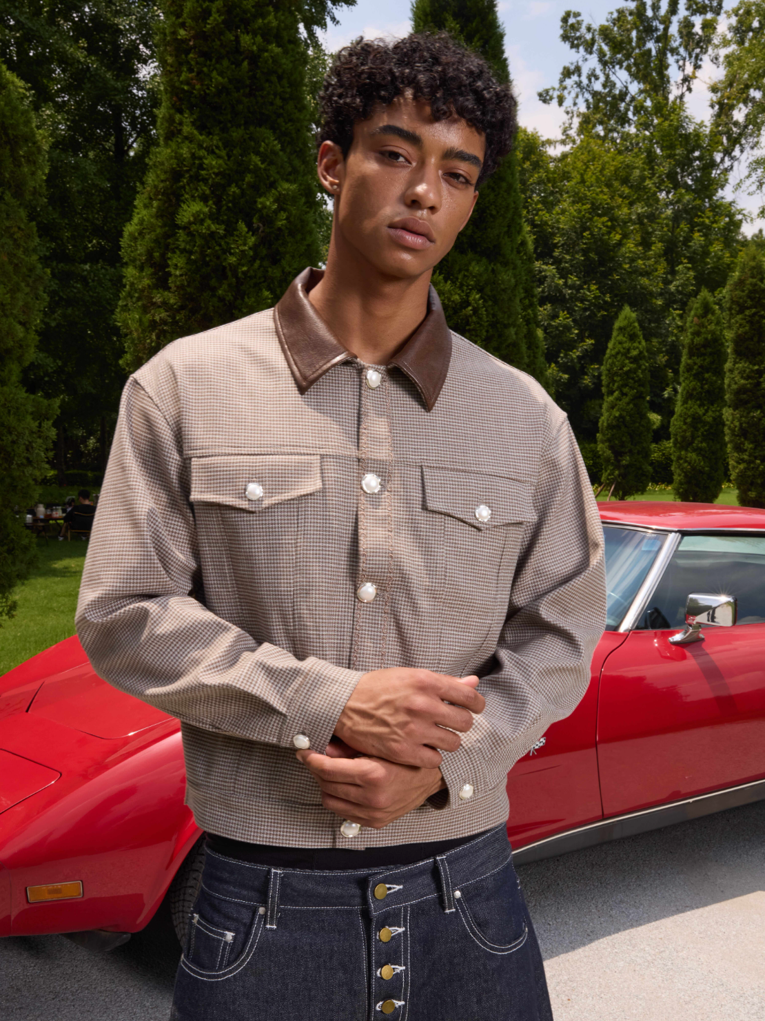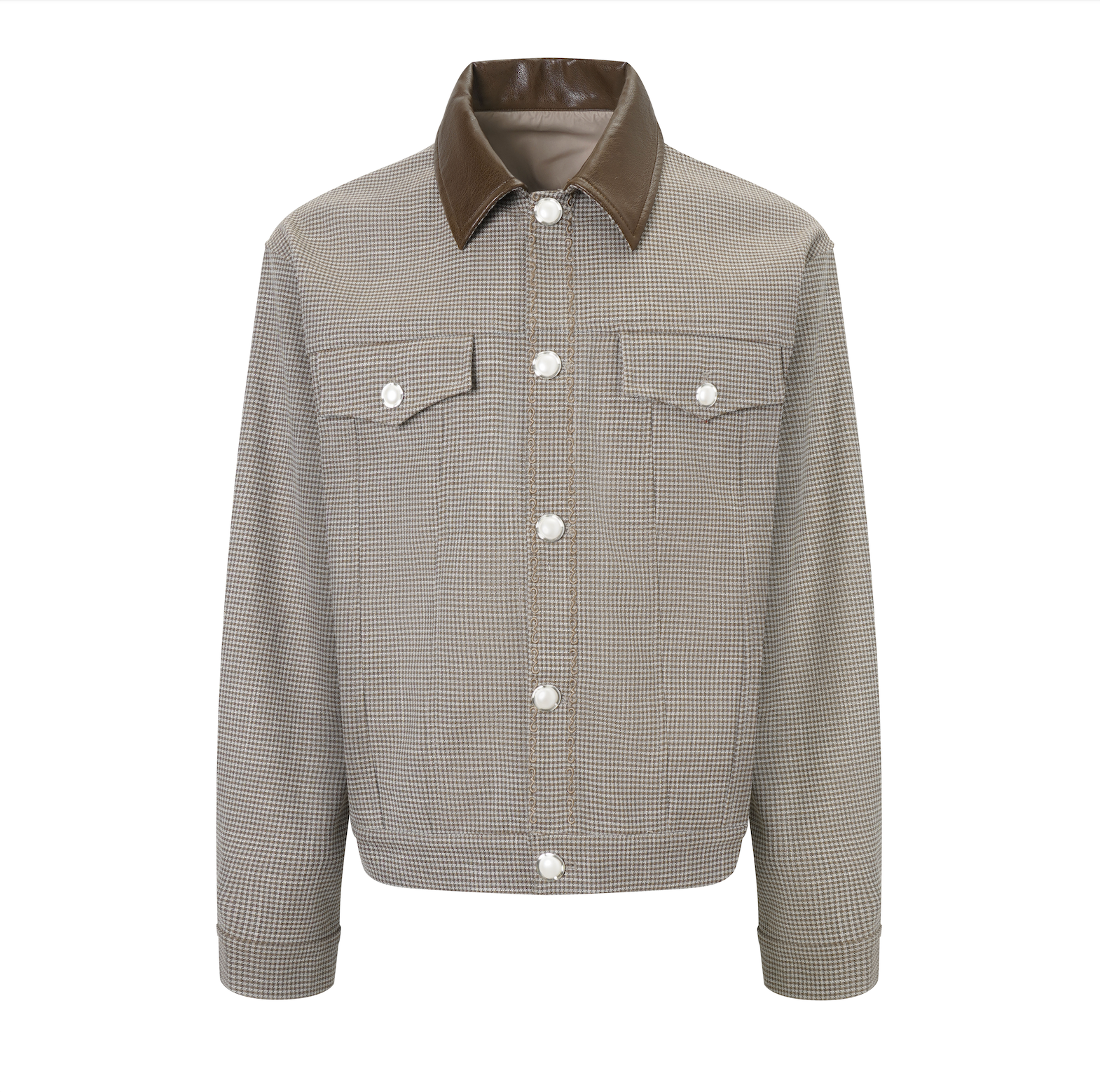 S45 Plaid Pearl Button Leather Lapel Short Jacket | Face 3 Face