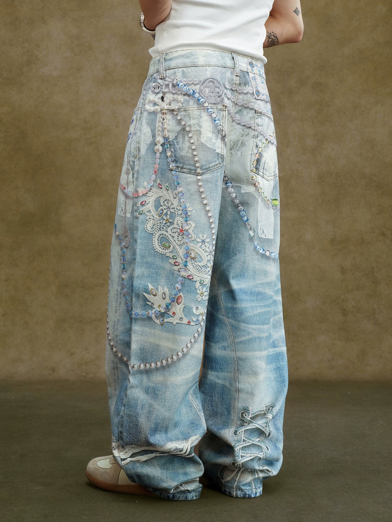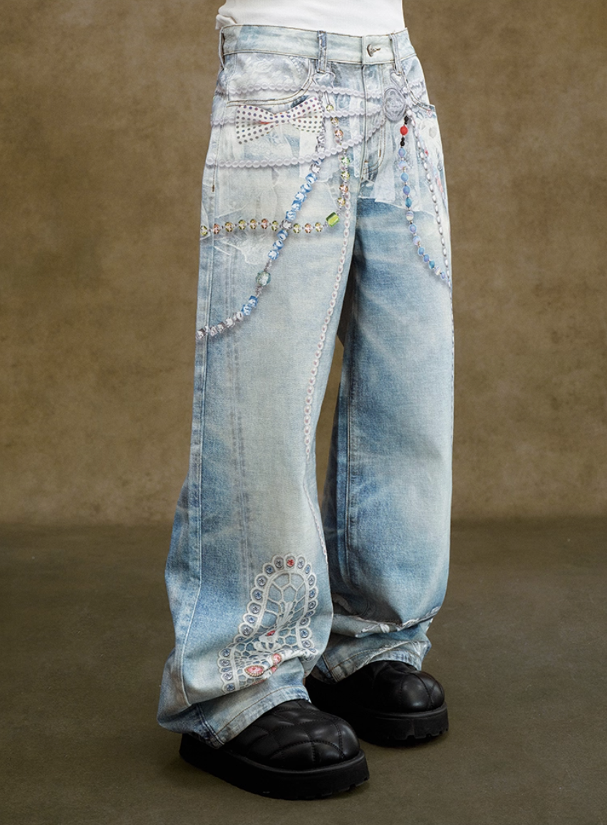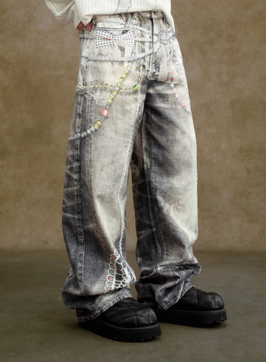 YADcrew Lace Color Bead Chain Photorealistic Print Jeans