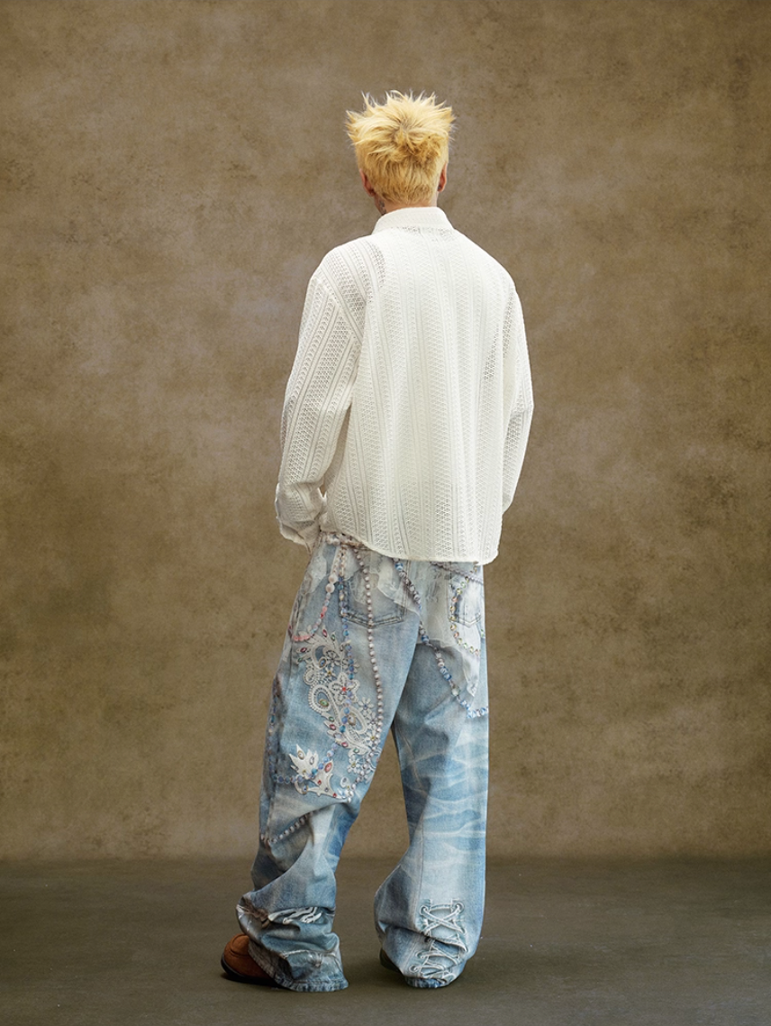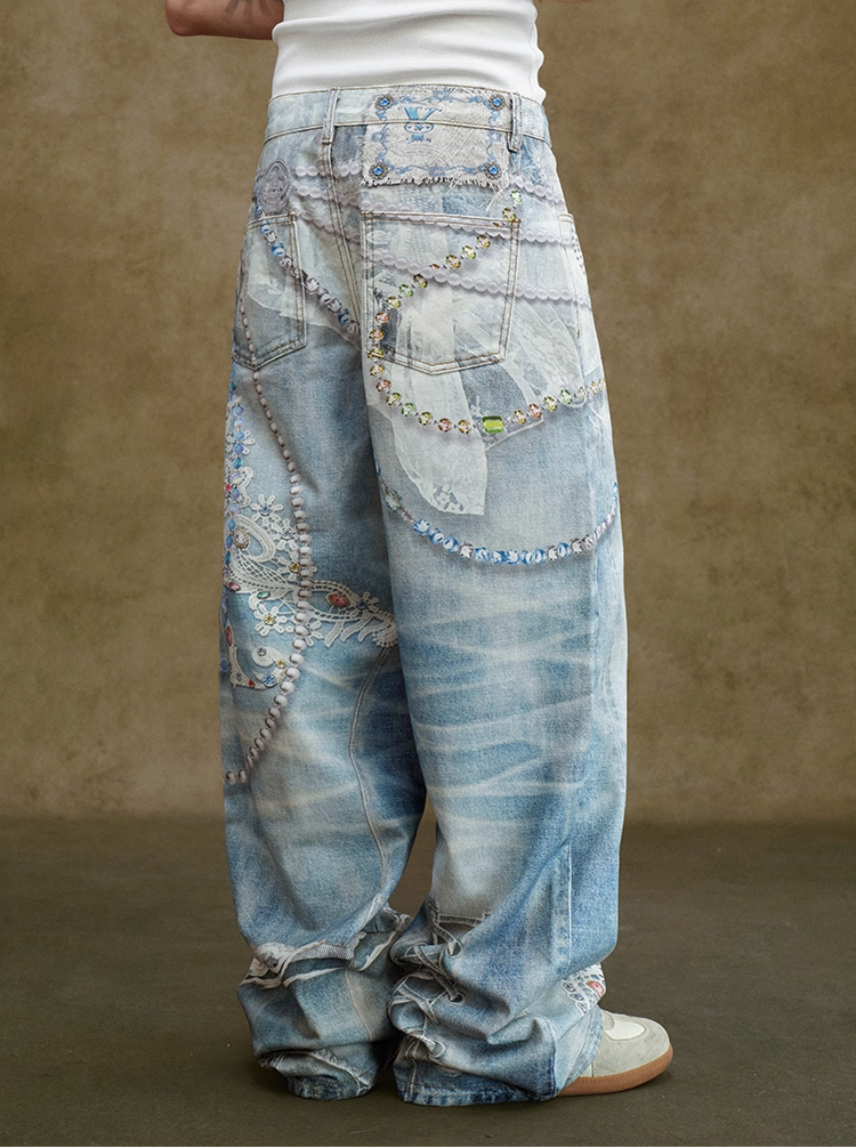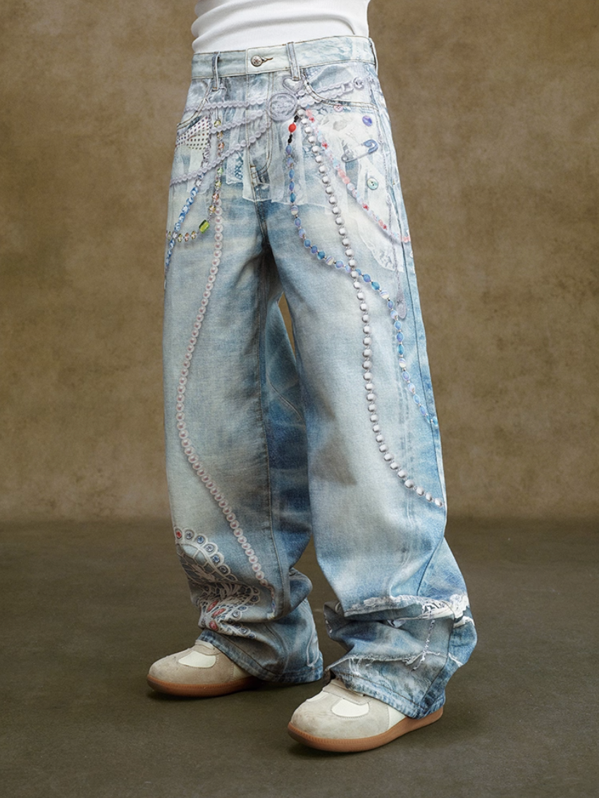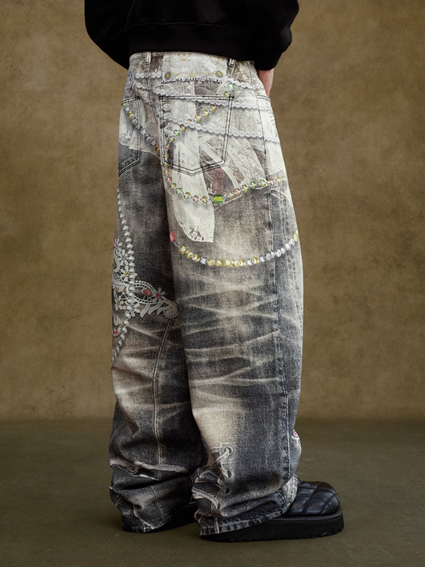 YADcrew Lace Color Bead Chain Photorealistic Print Jeans