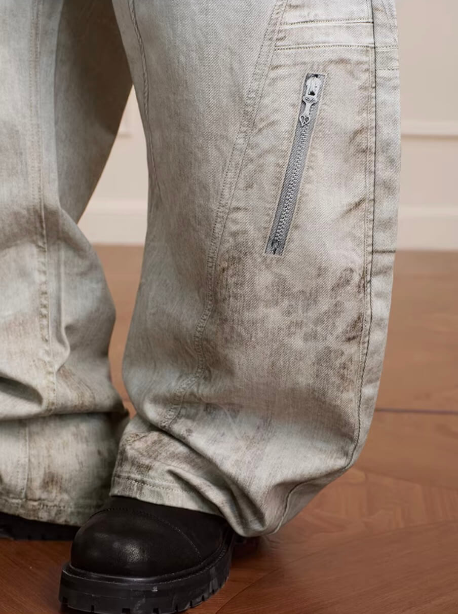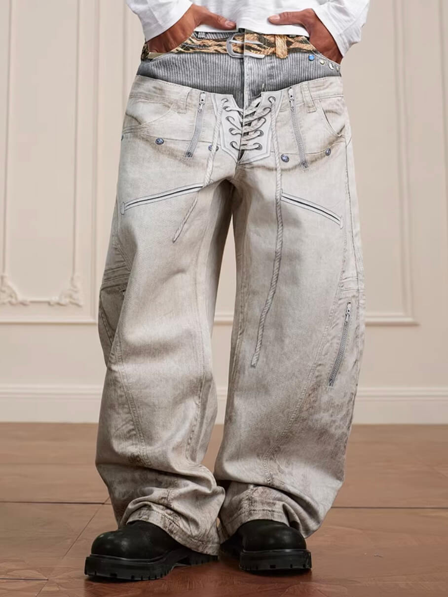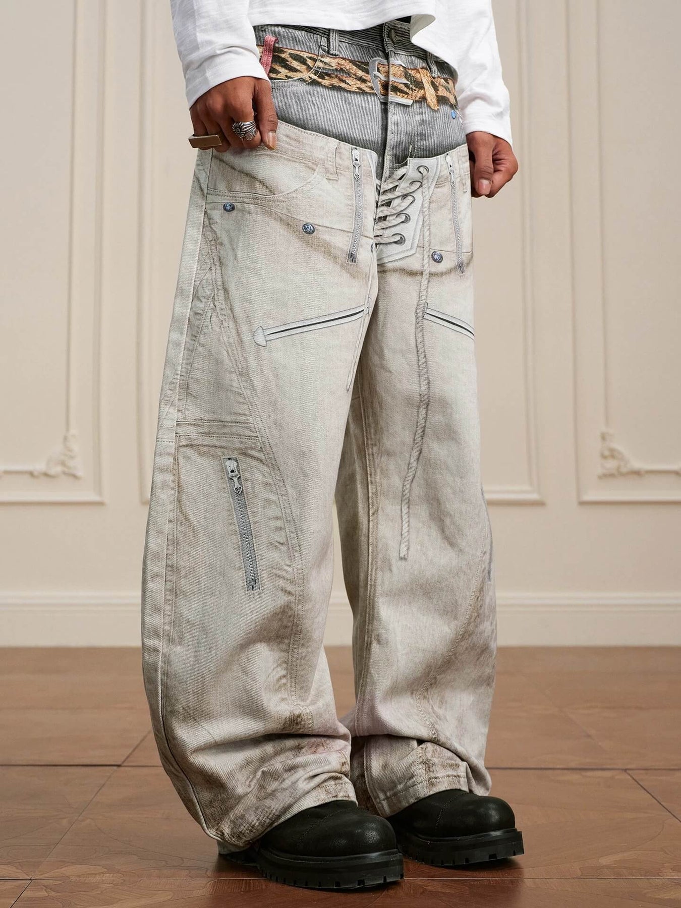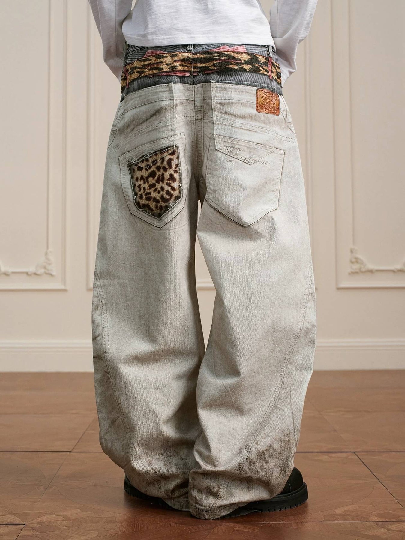 YADcrew Leopard Belt Double Waist 3D Digital Print Machete Jeans