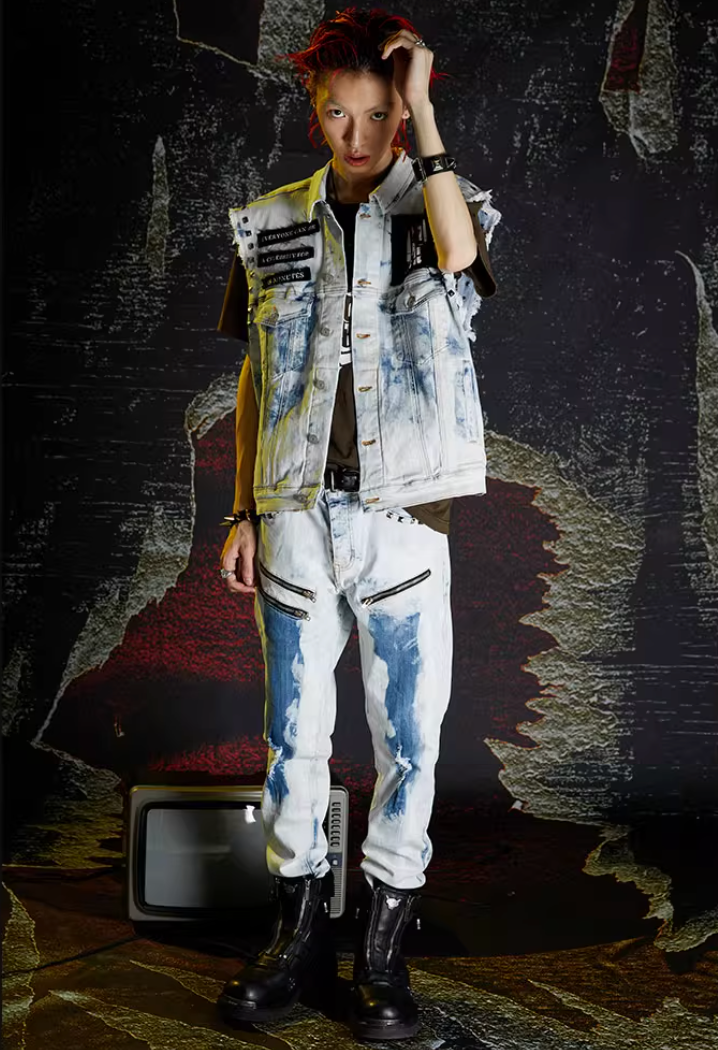 VENTUREK Bleach Wash Rivet Zipper Slim Jeans