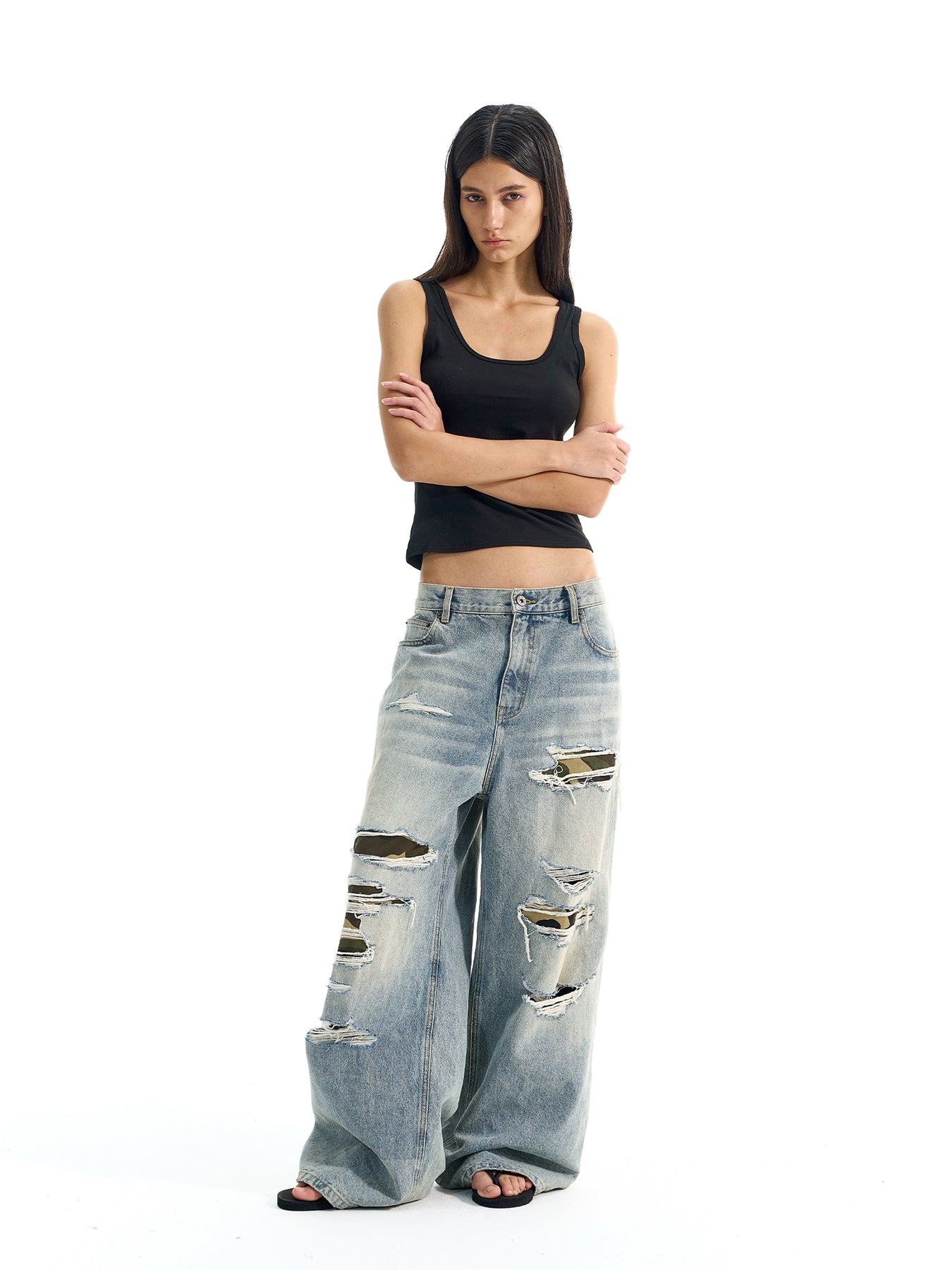 BLIND NO PLAN Washed Blue Ripped Camo Patch Baggy Jeans
