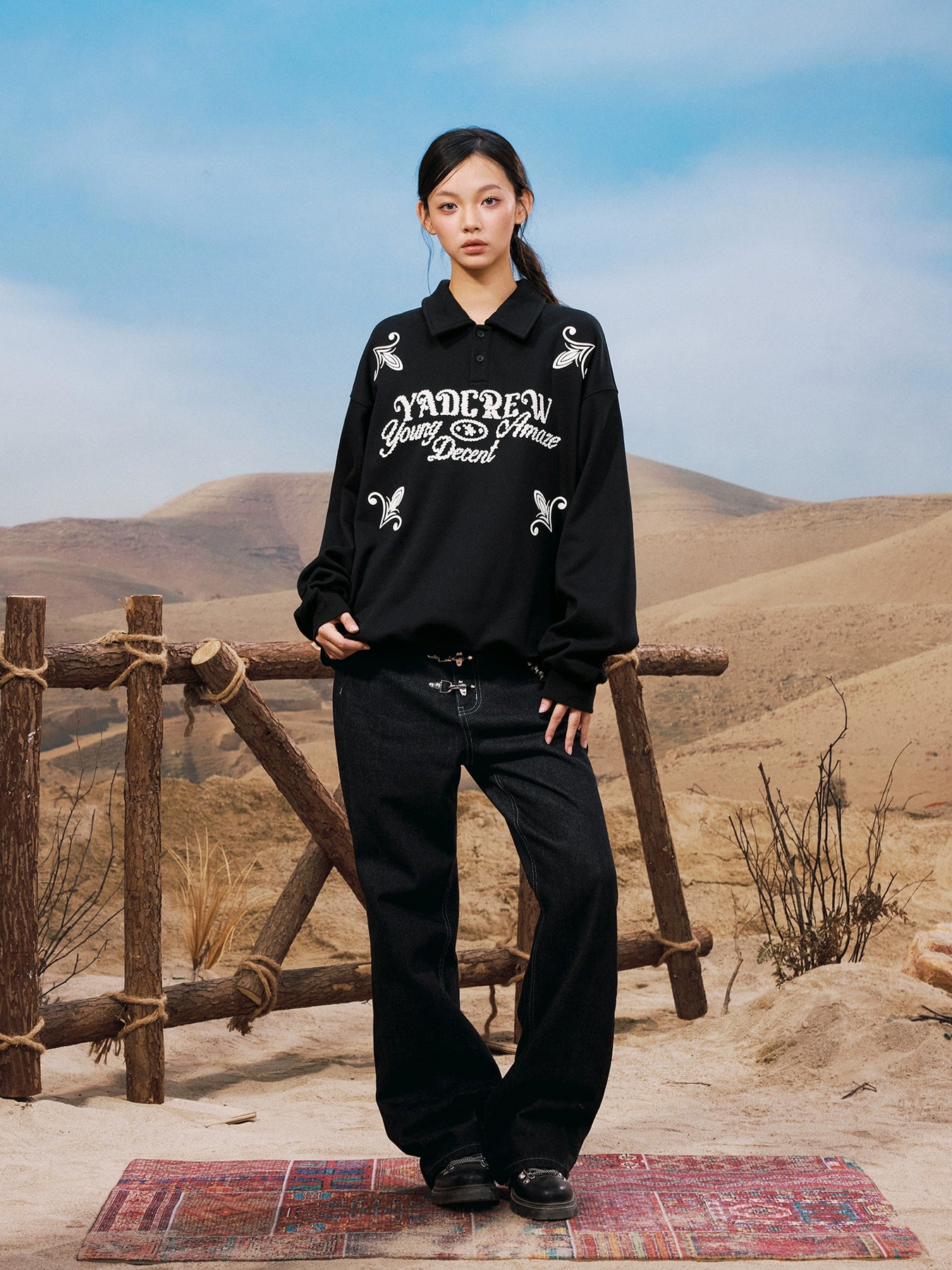 YADcrew Rope Knot Foam Print Embroidered Polo Sweatshirt