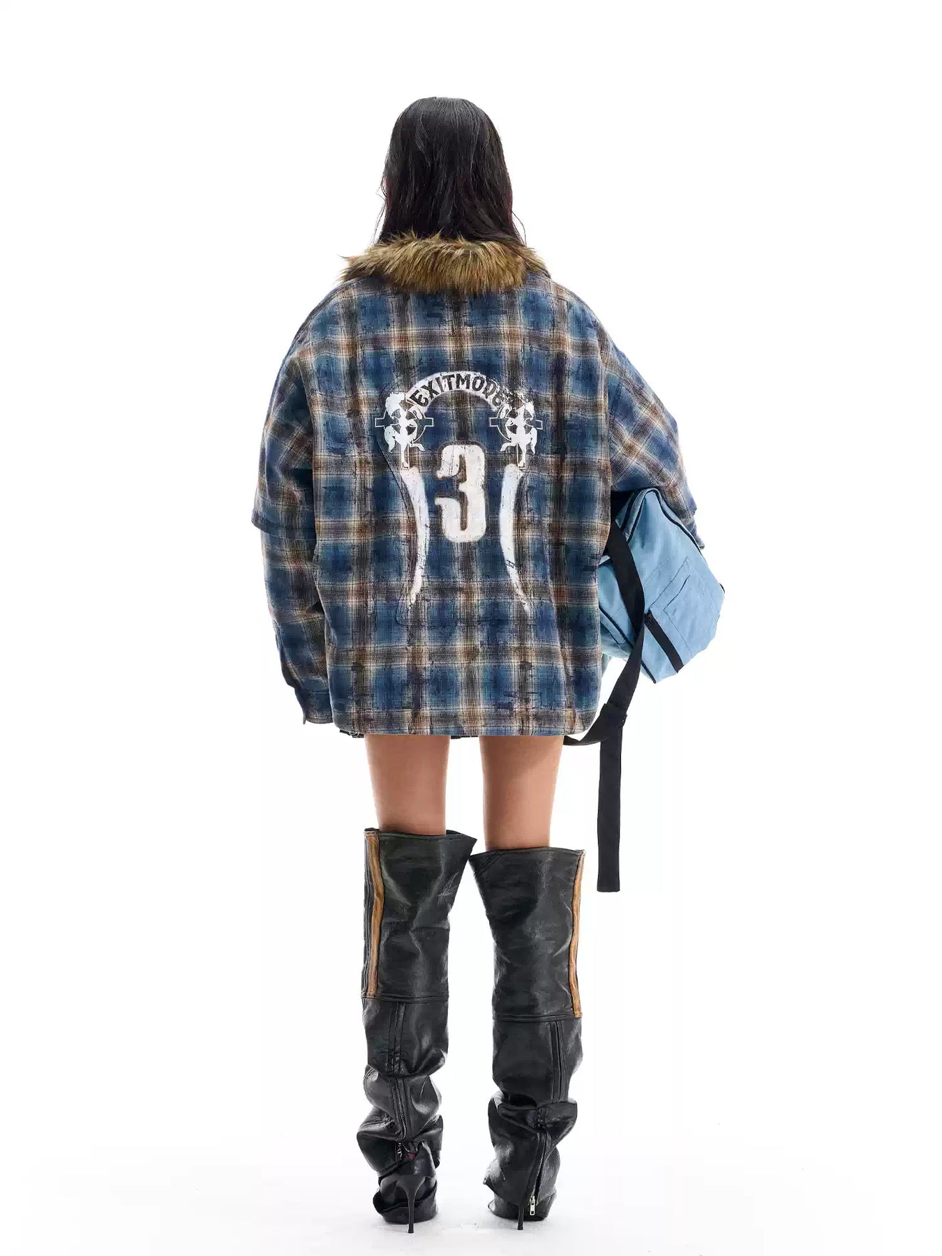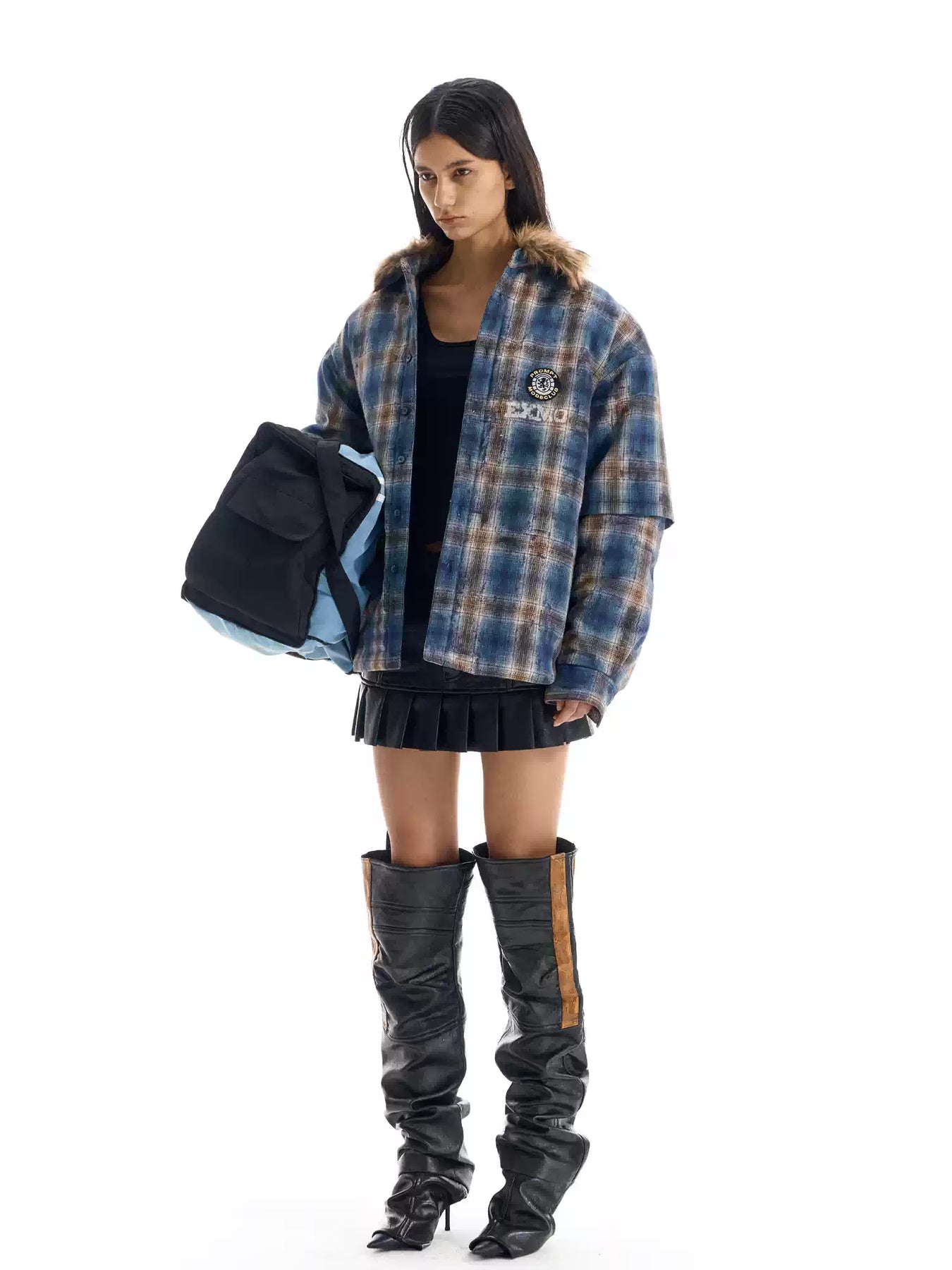 BLIND NO PLAN Fur Collar Plaid Padded Shirt Jacket