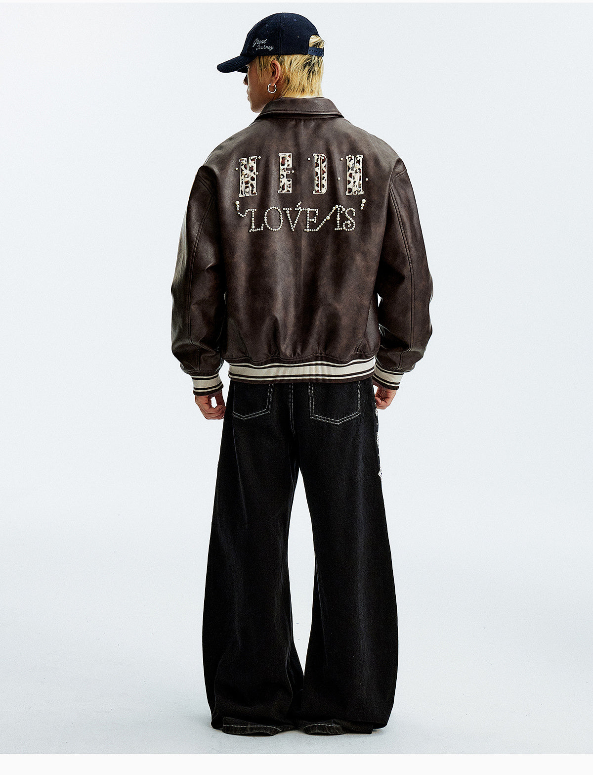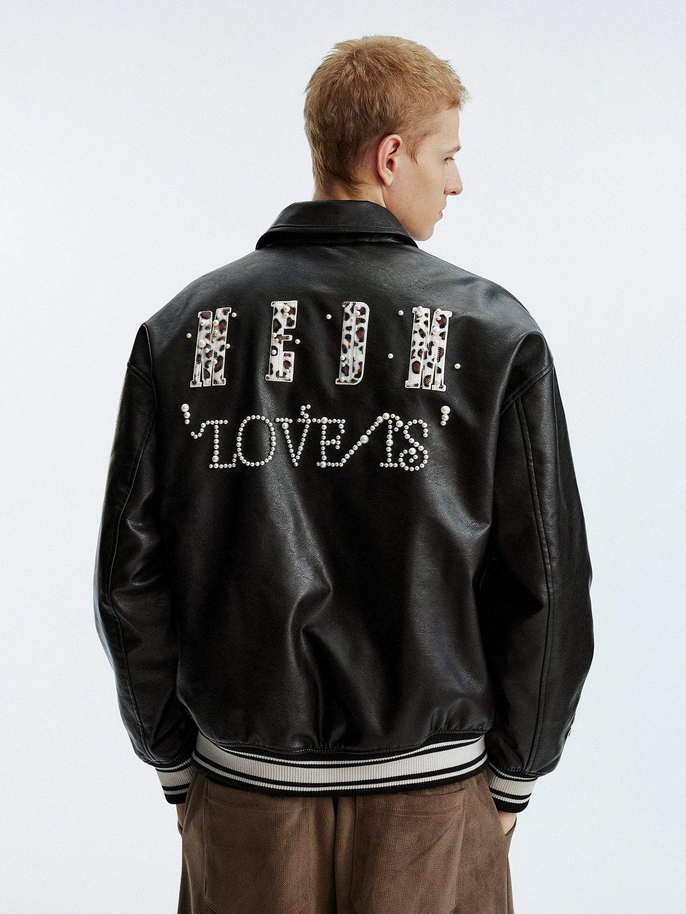MEDM Leopard Patch Pearl PU Leather Varsity Jacket